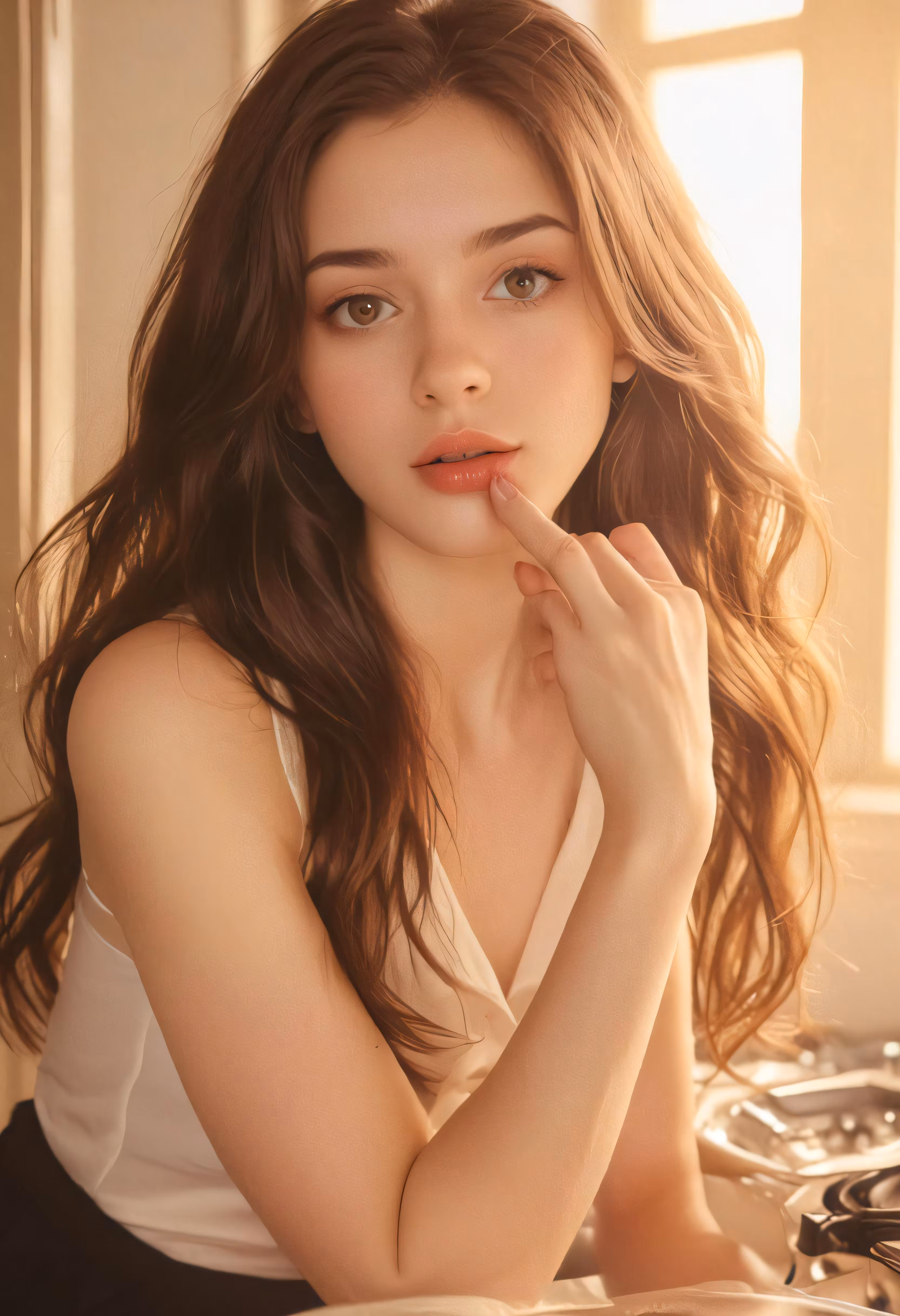 High resolution picture, free to use, the woman is posing in her bed with her hand under her chin