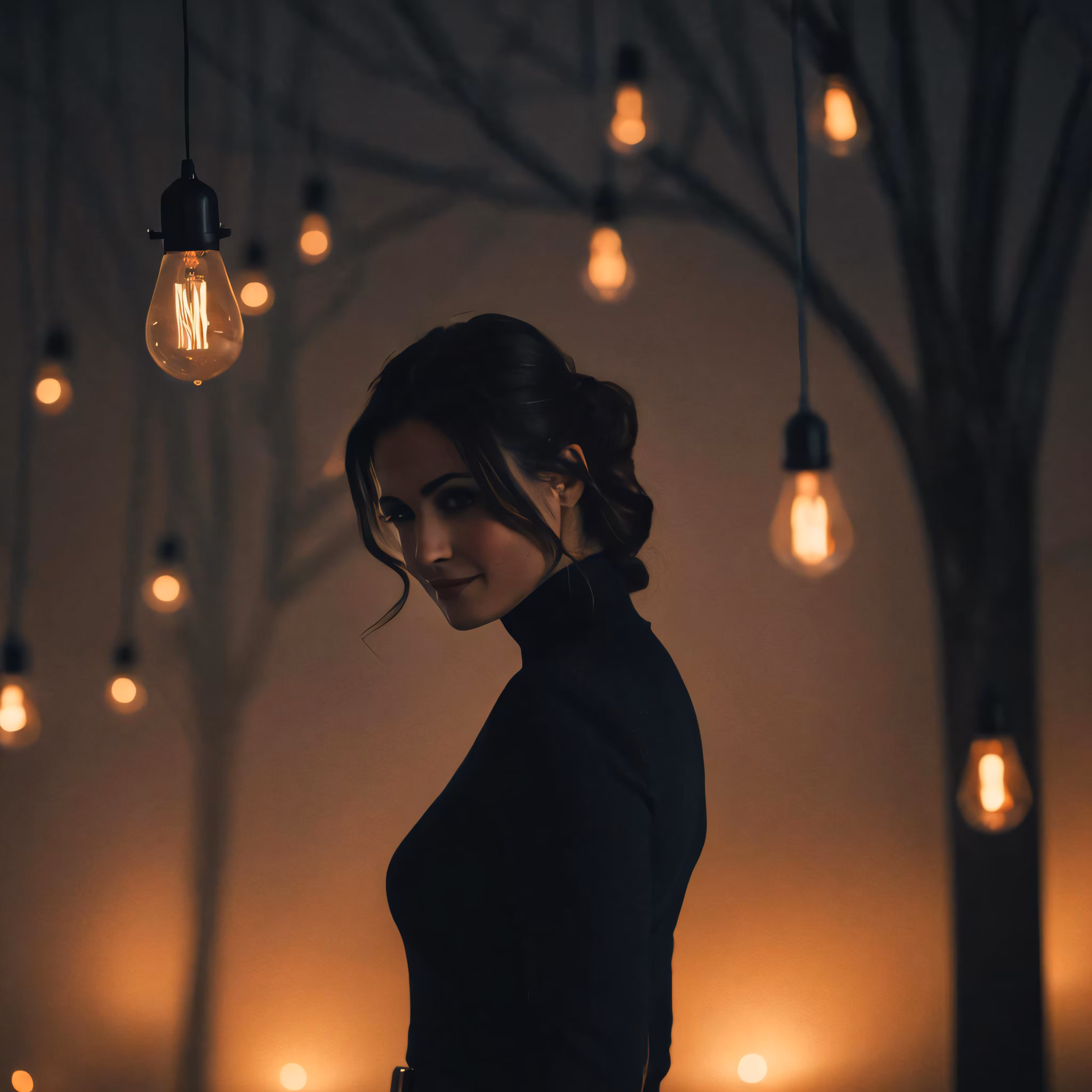 High resolution picture, free to use, the woman is standing under light bulbs in the forest