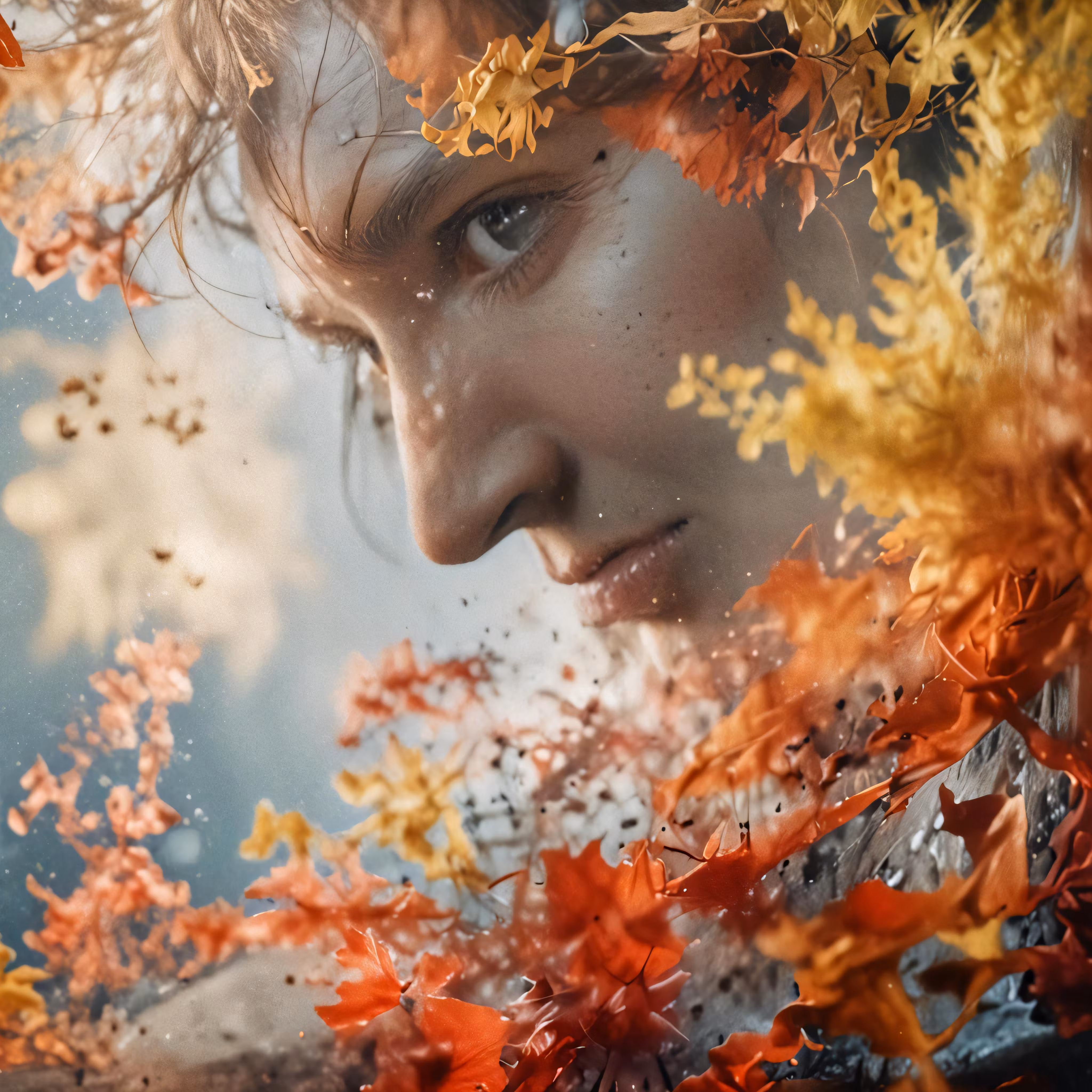 High resolution picture, free to use, the woman is surrounded by falling leaves