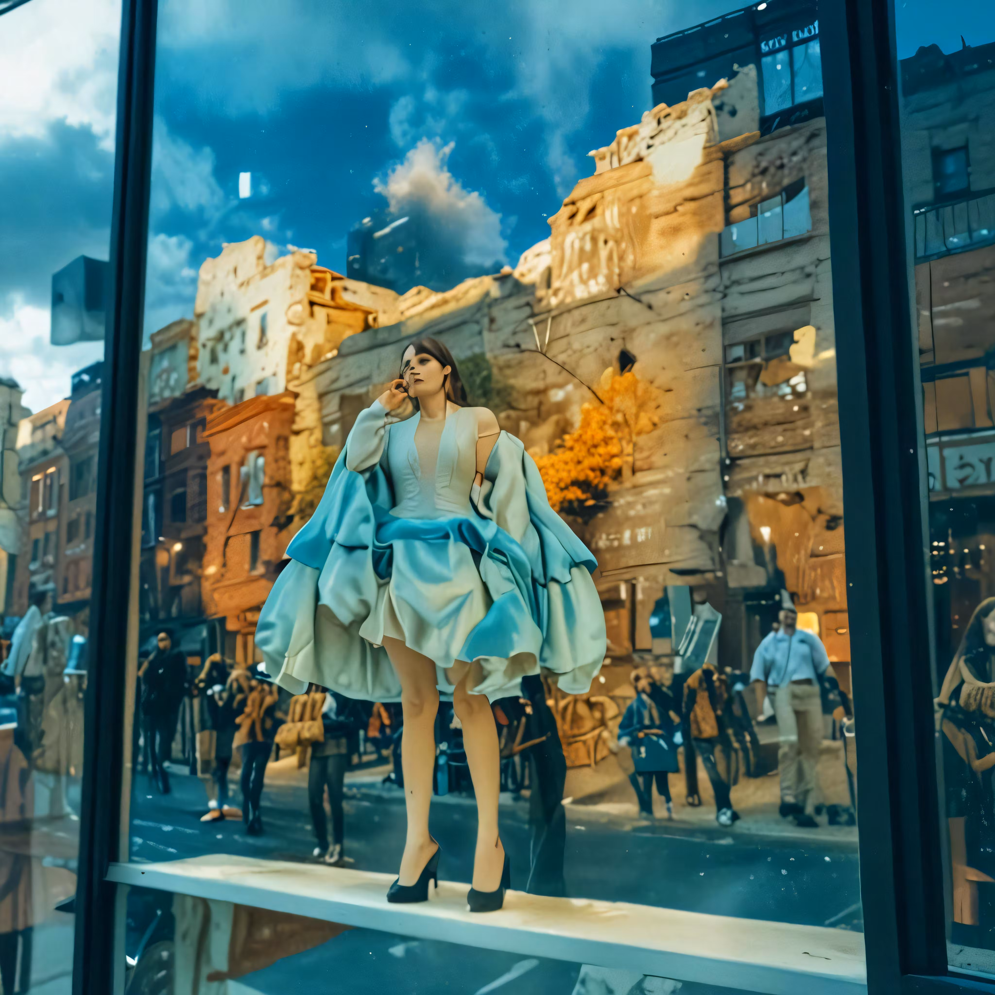 High resolution picture, free to use, the woman is walking down the street wearing a blue dress