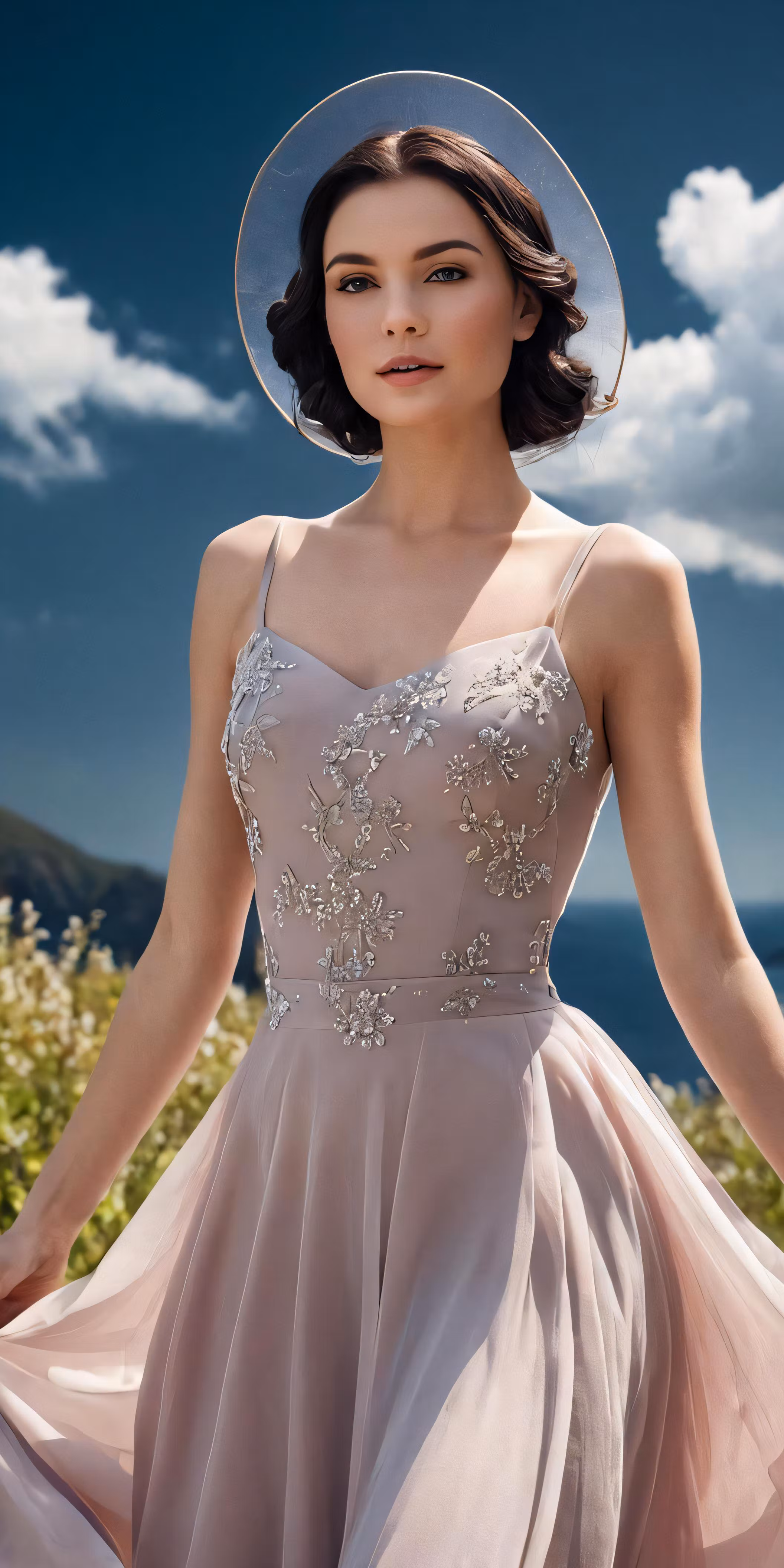 High resolution picture, free to use, the woman is wearing a dress with a nice hat on it