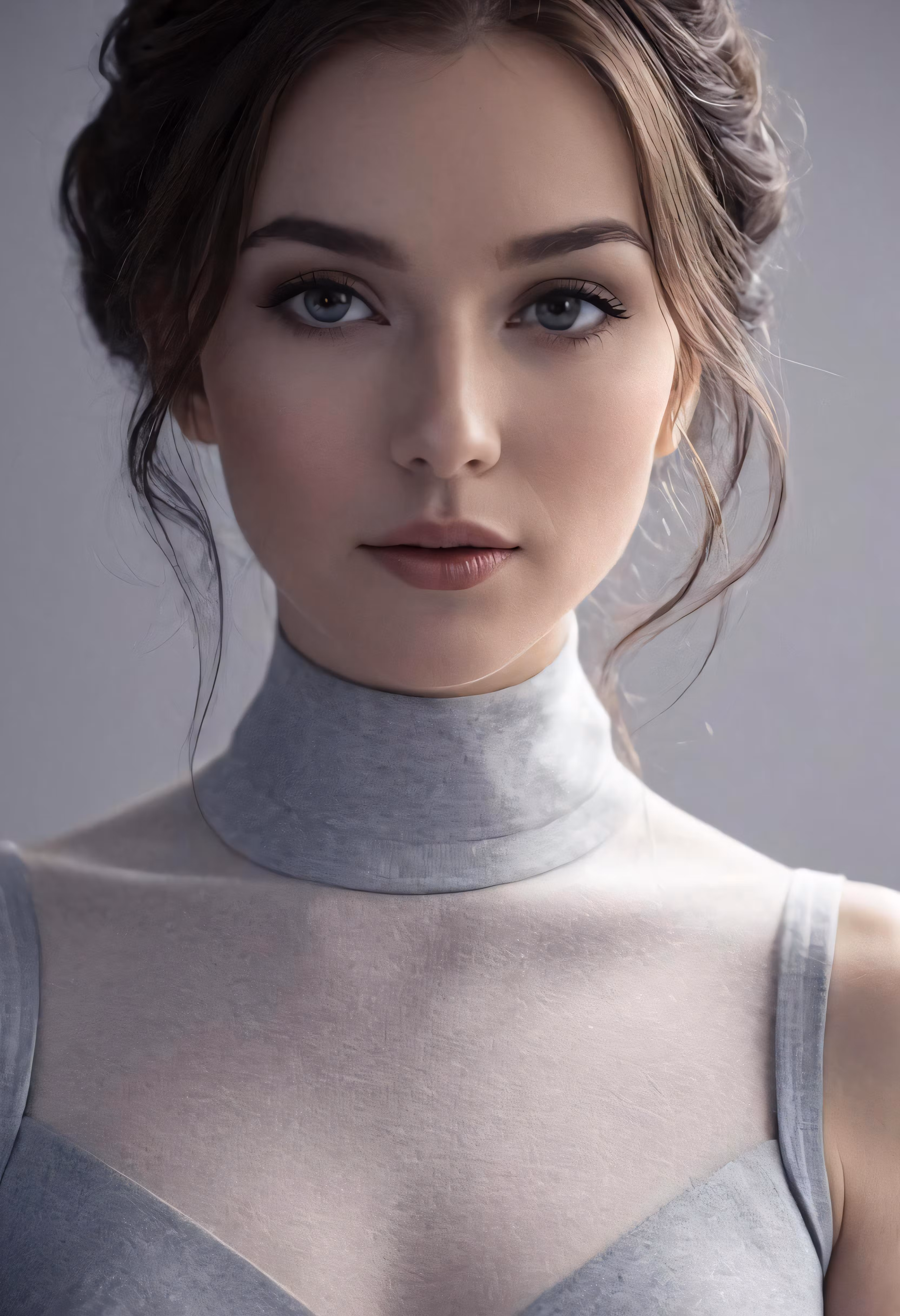 High resolution picture, free to use, the woman is wearing a gray dress and is looking directly at the camera