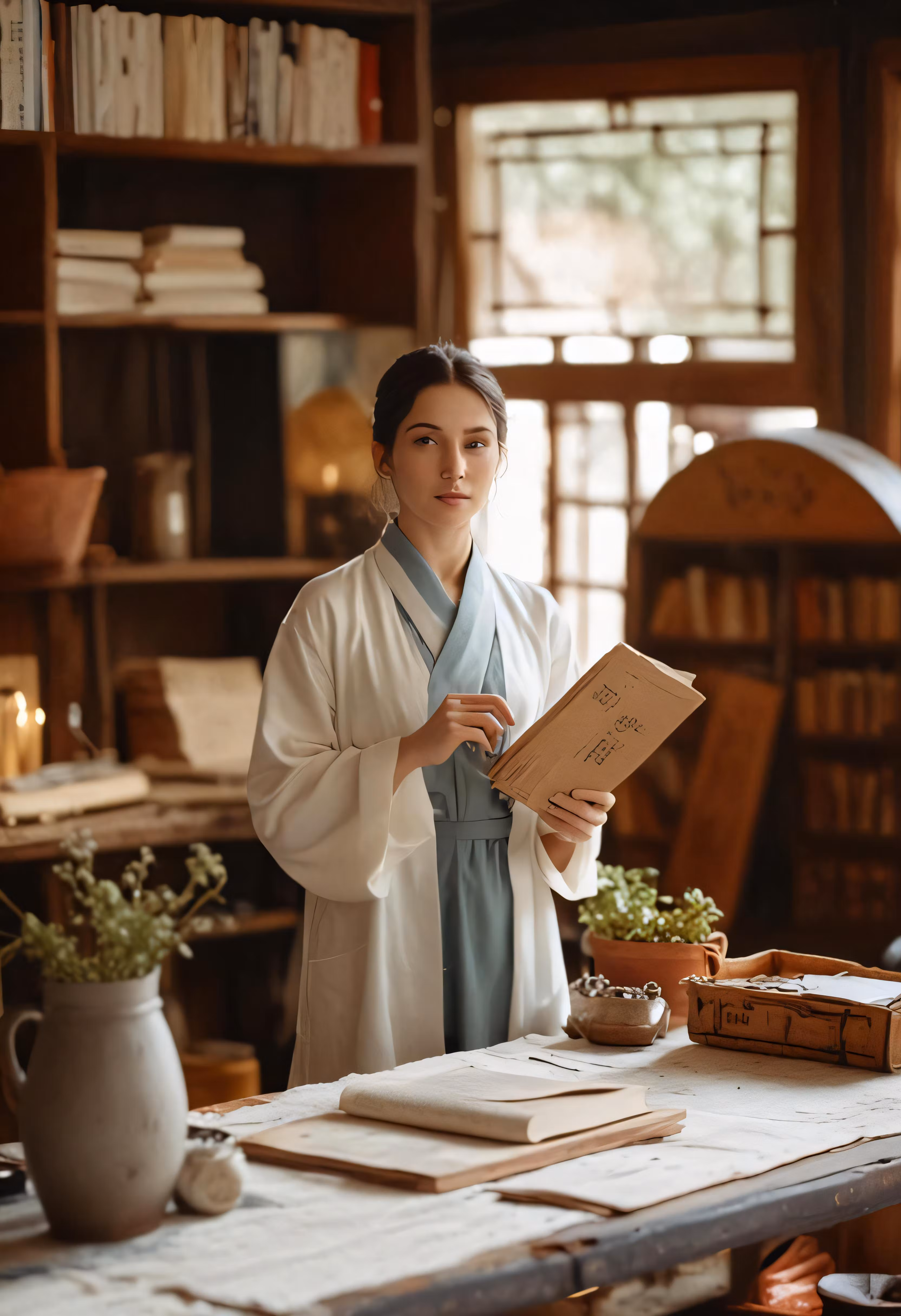 High resolution picture, free to use, the woman is wearing an asian style robe holding a menu