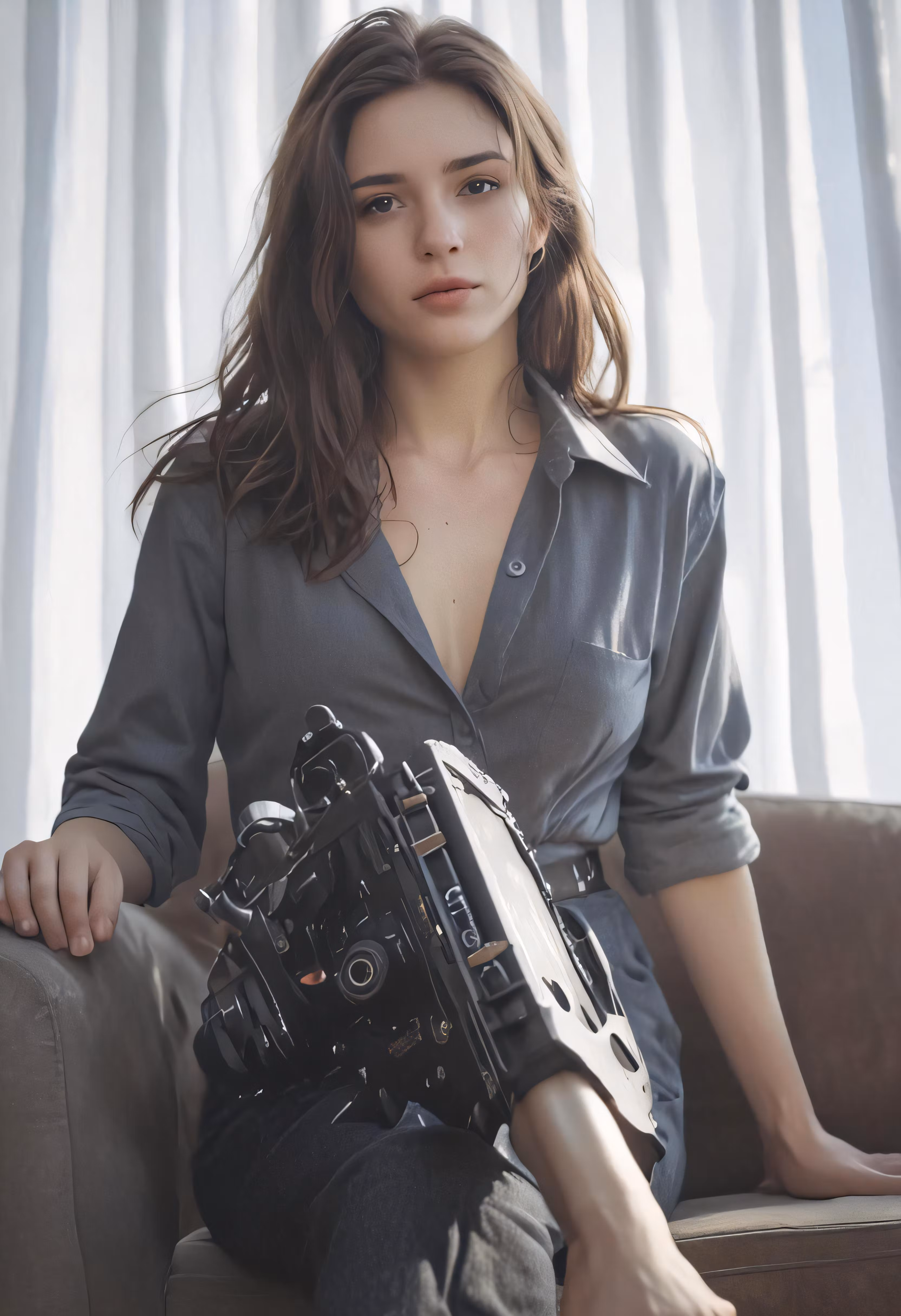 High resolution picture, free to use, the woman sits on a brown couch while holding a camera
