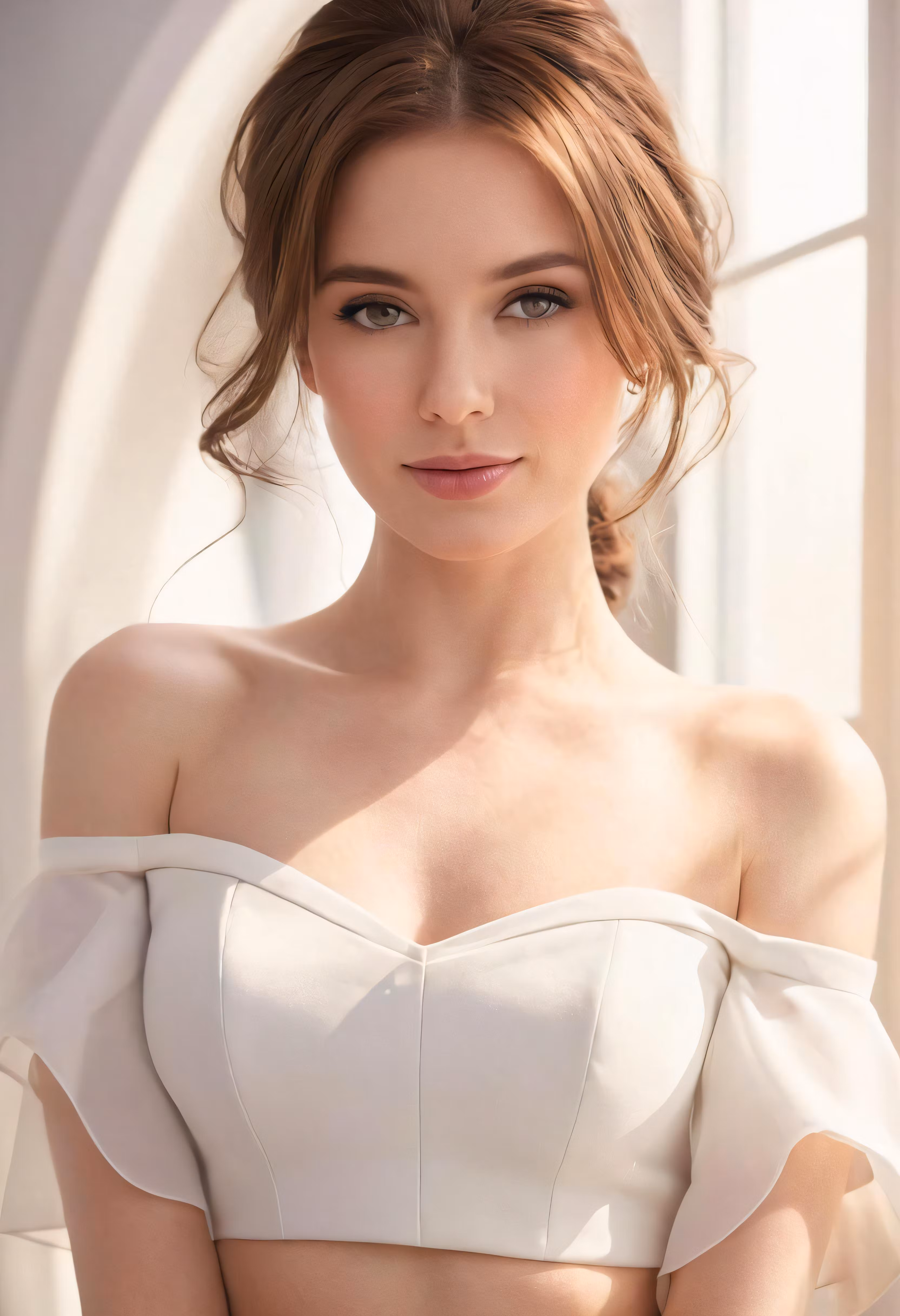 High resolution picture, free to use, the woman wearing a white dress stands near a window