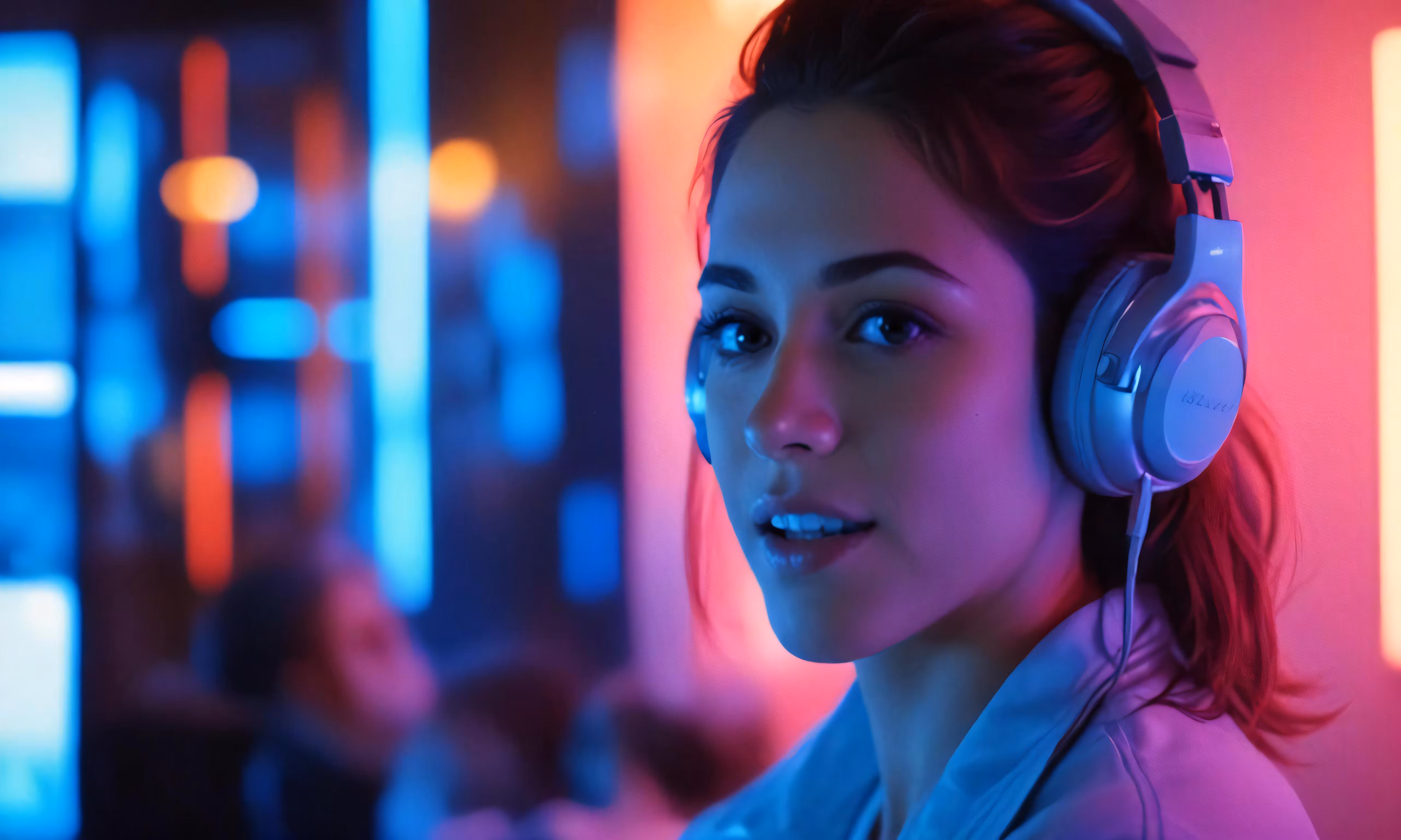 High resolution picture, free to use, the woman wearing headphones looks up to her left