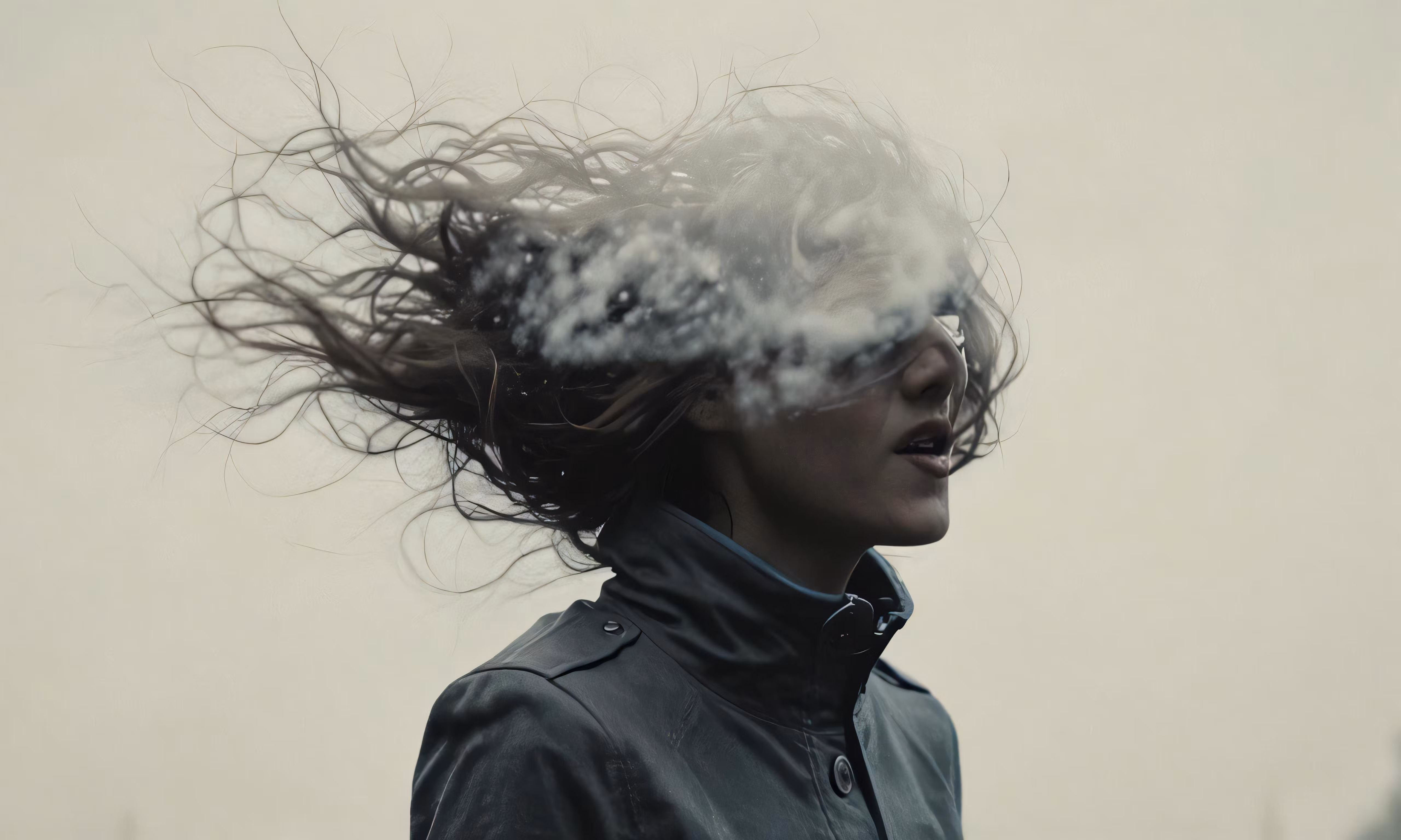High resolution picture, free to use, the woman with her hair blowing in the wind