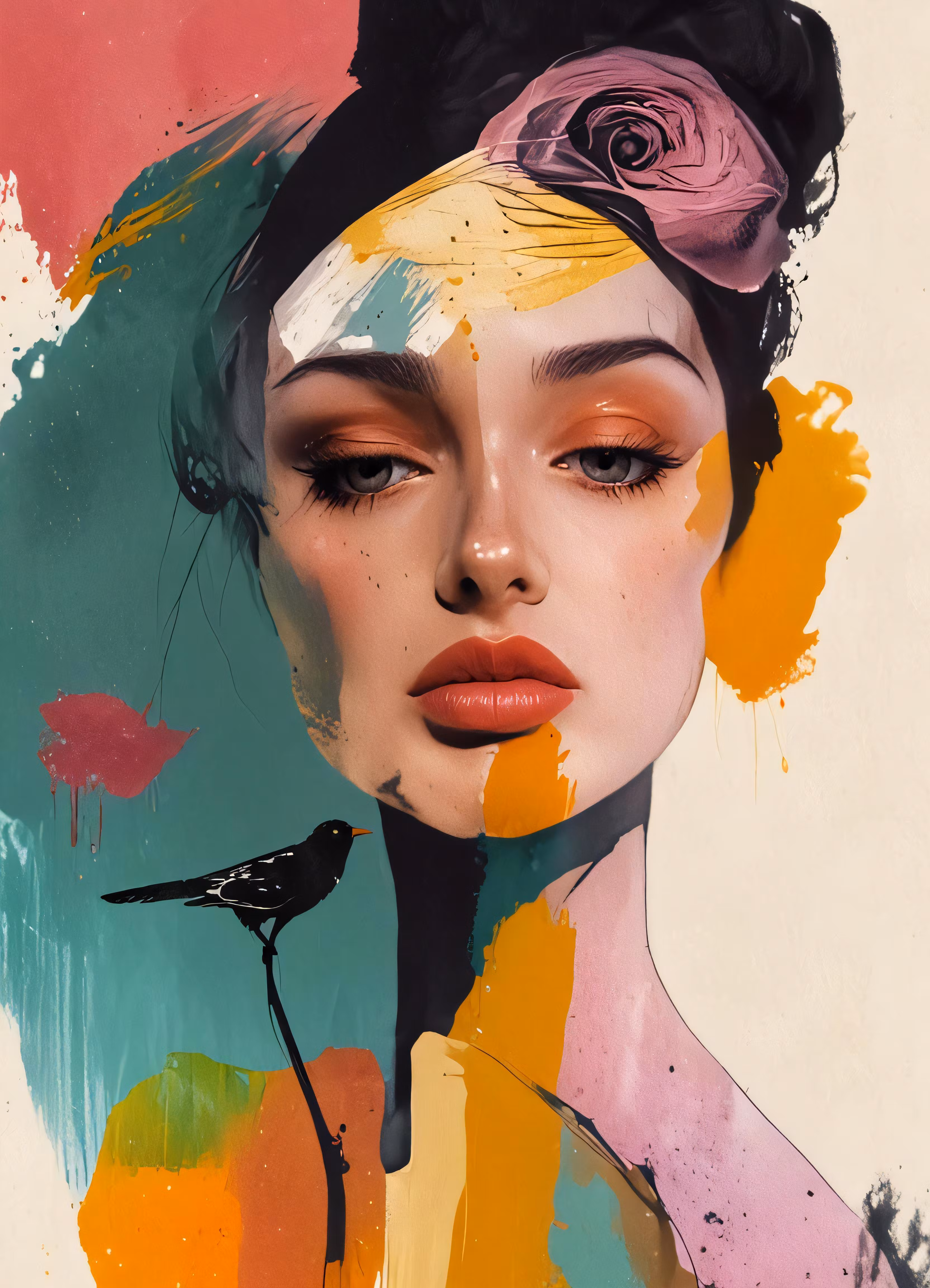 High resolution picture, free to use, the woman with painted flowers on her head is a bright, colorful painting