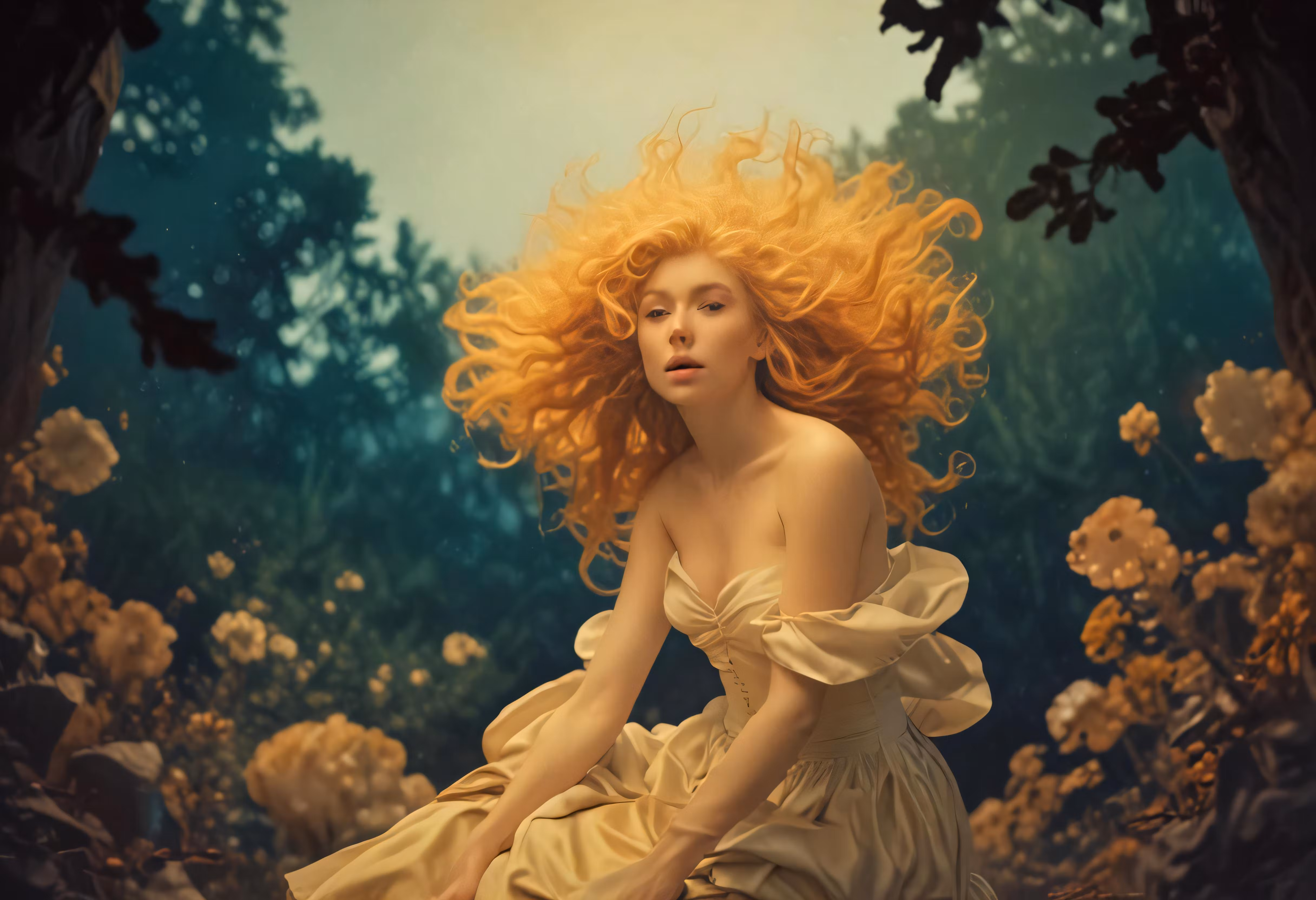 High resolution picture, free to use, the woman with the yellow hair looks off into the distance