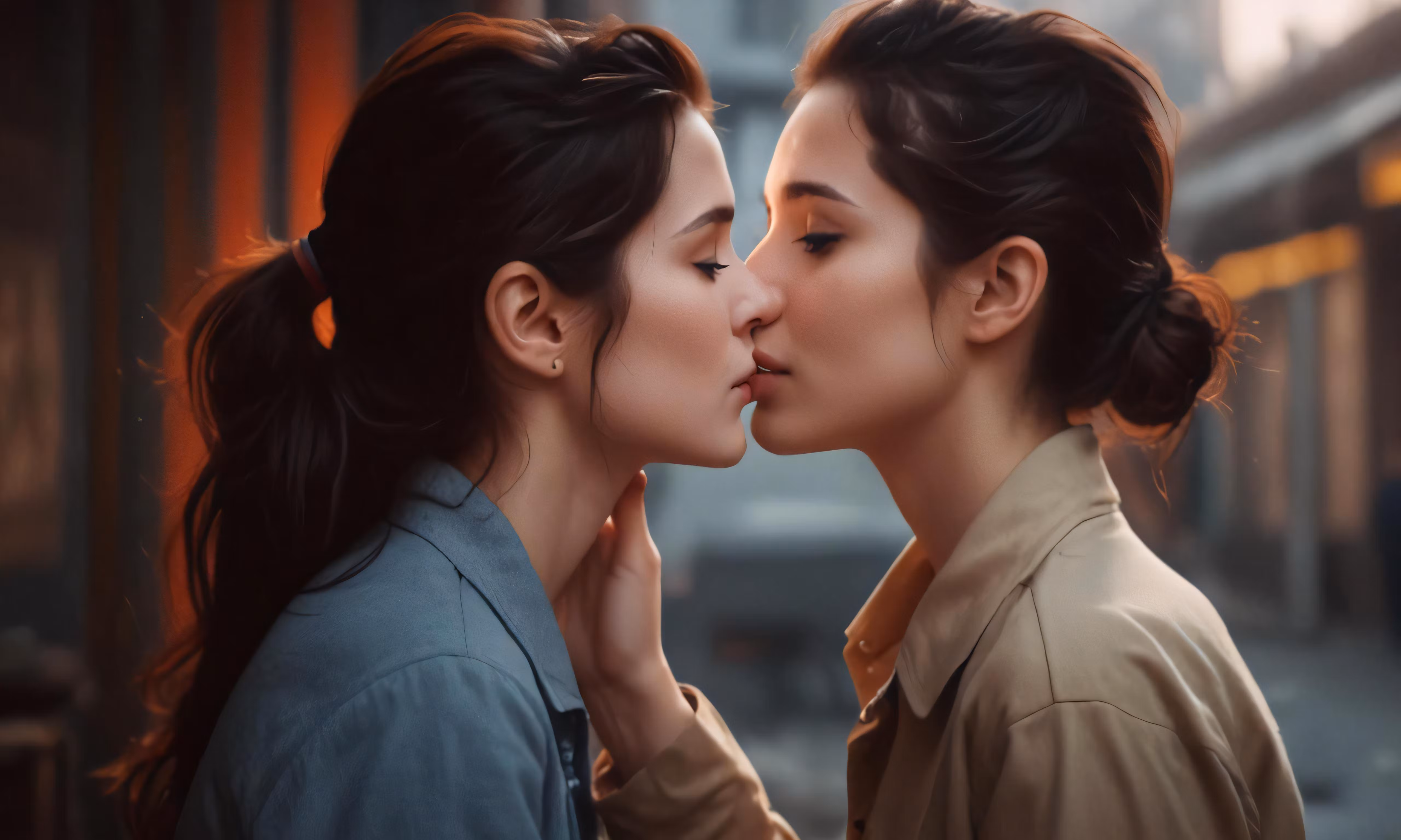 High resolution picture, free to use, the women are sharing a kiss while wearing jackets