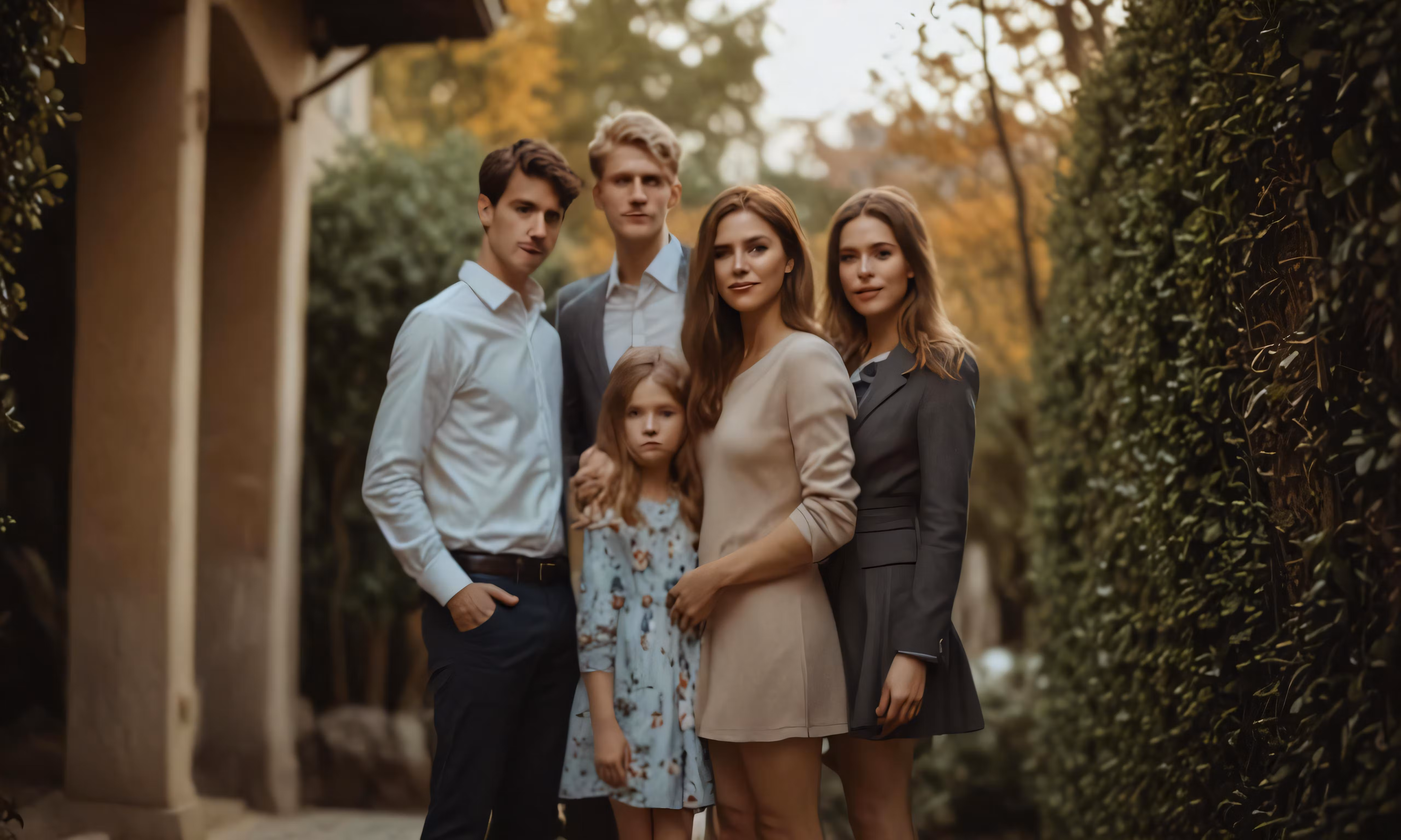 High resolution picture, free to use, the young family is posing for a picture in front of a house