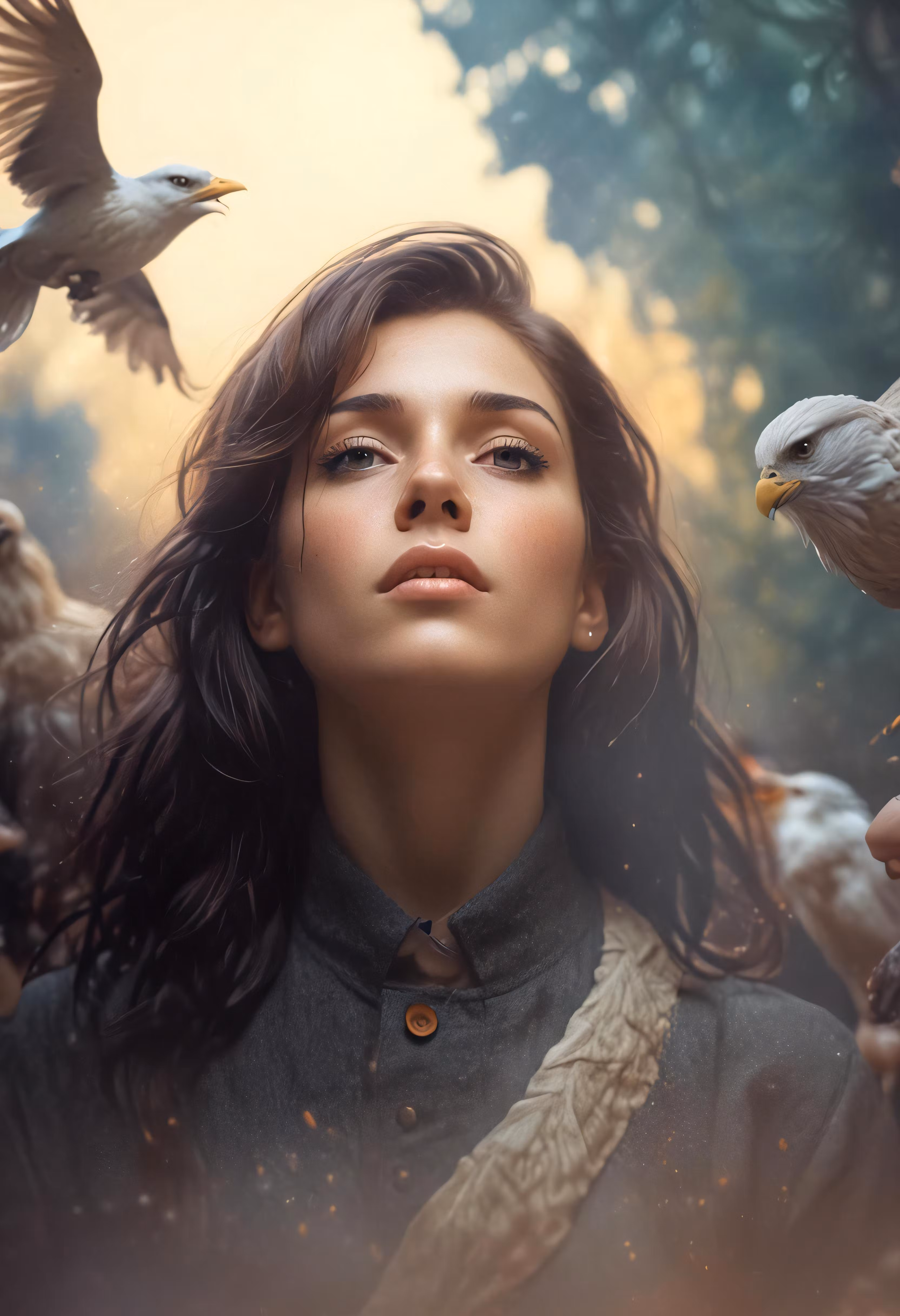 High resolution picture, free to use, the young lady is looking up at the birds flying around her