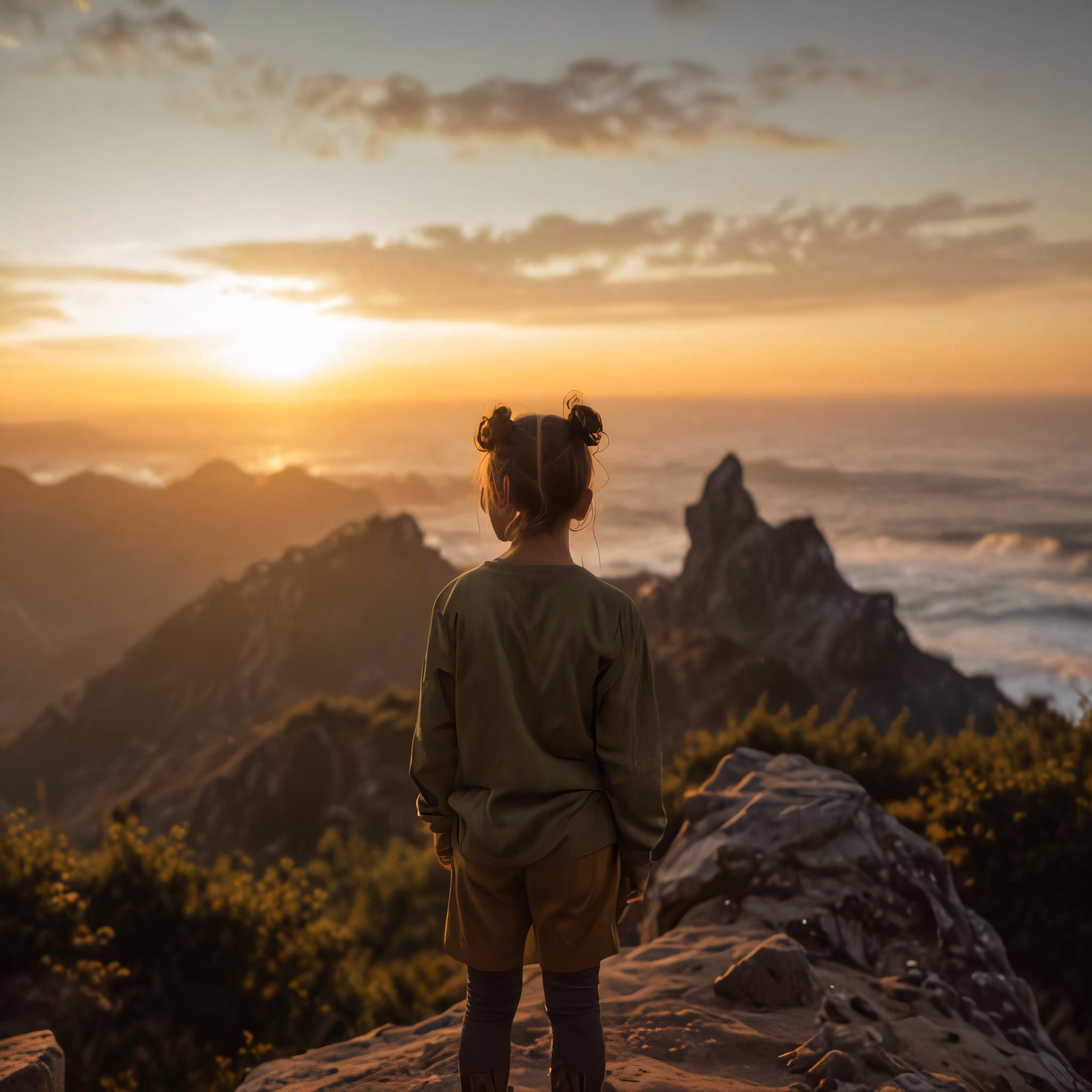 High resolution picture, free to use, the young person stands on top of a mountain overlooking the ocean