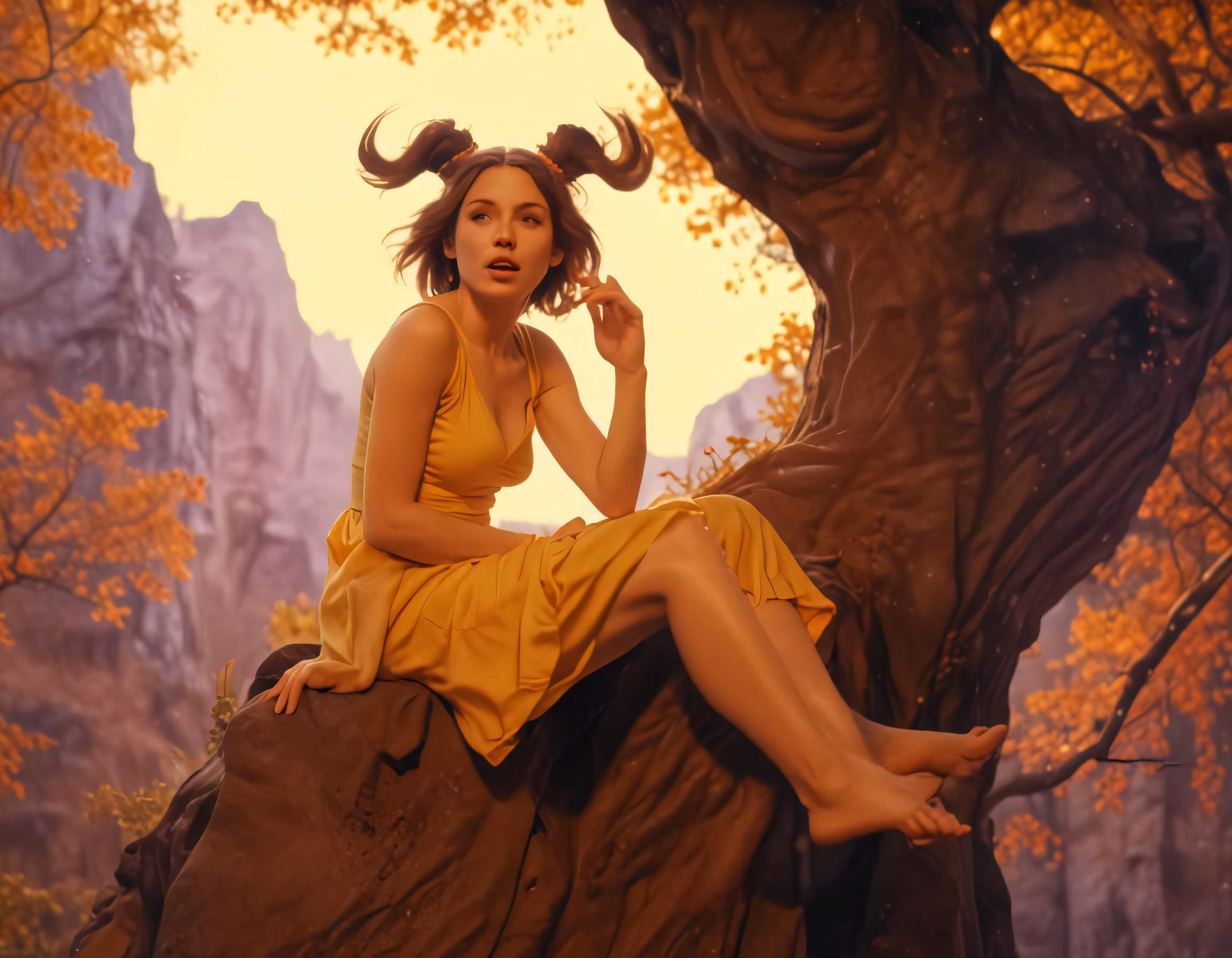 High resolution picture, free to use, the young woman is sitting on a rock outside in front of a tree