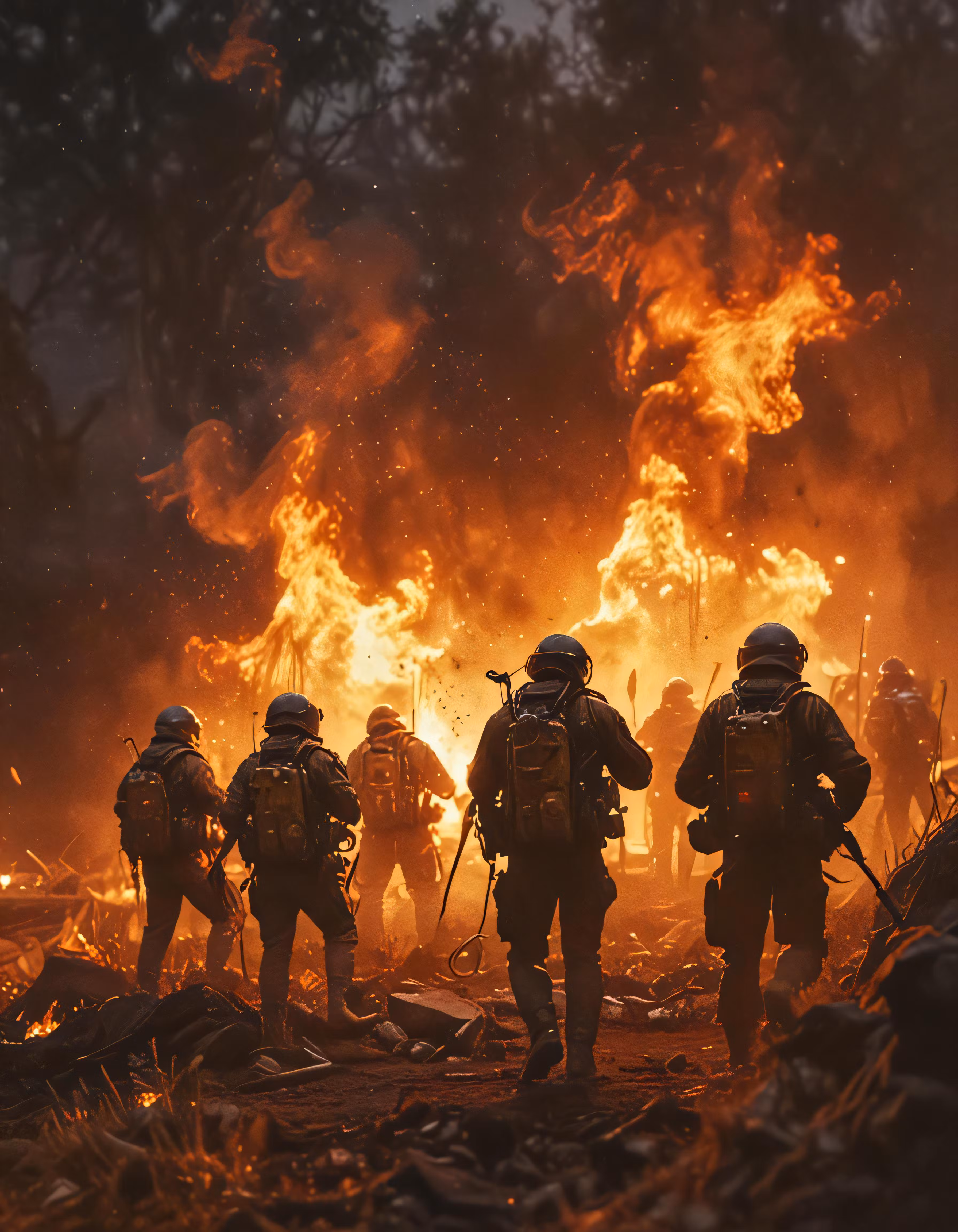 High resolution picture, free to use, there are five fire fighters that are near the huge fire