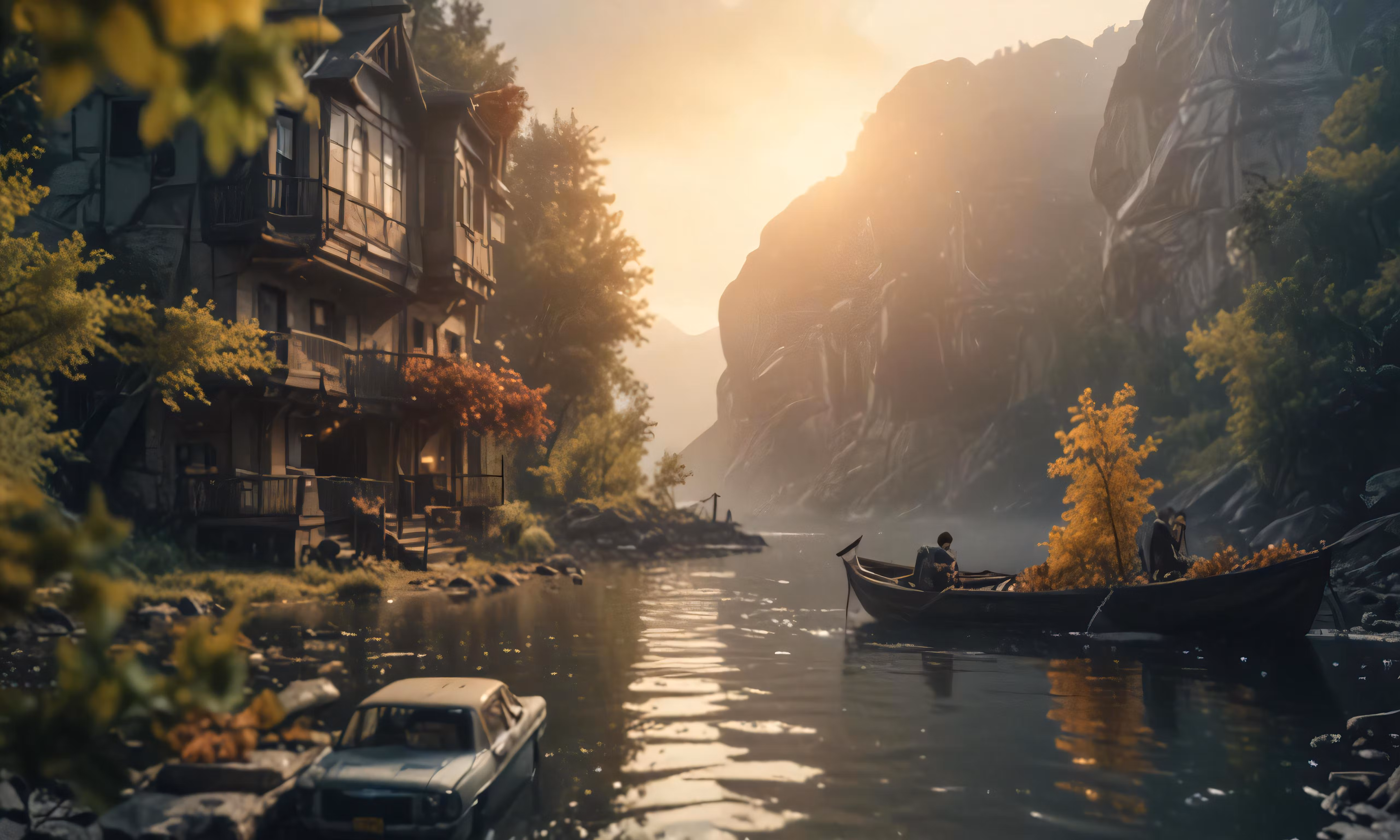 High resolution picture, free to use, there are two people in a boat riding along the river