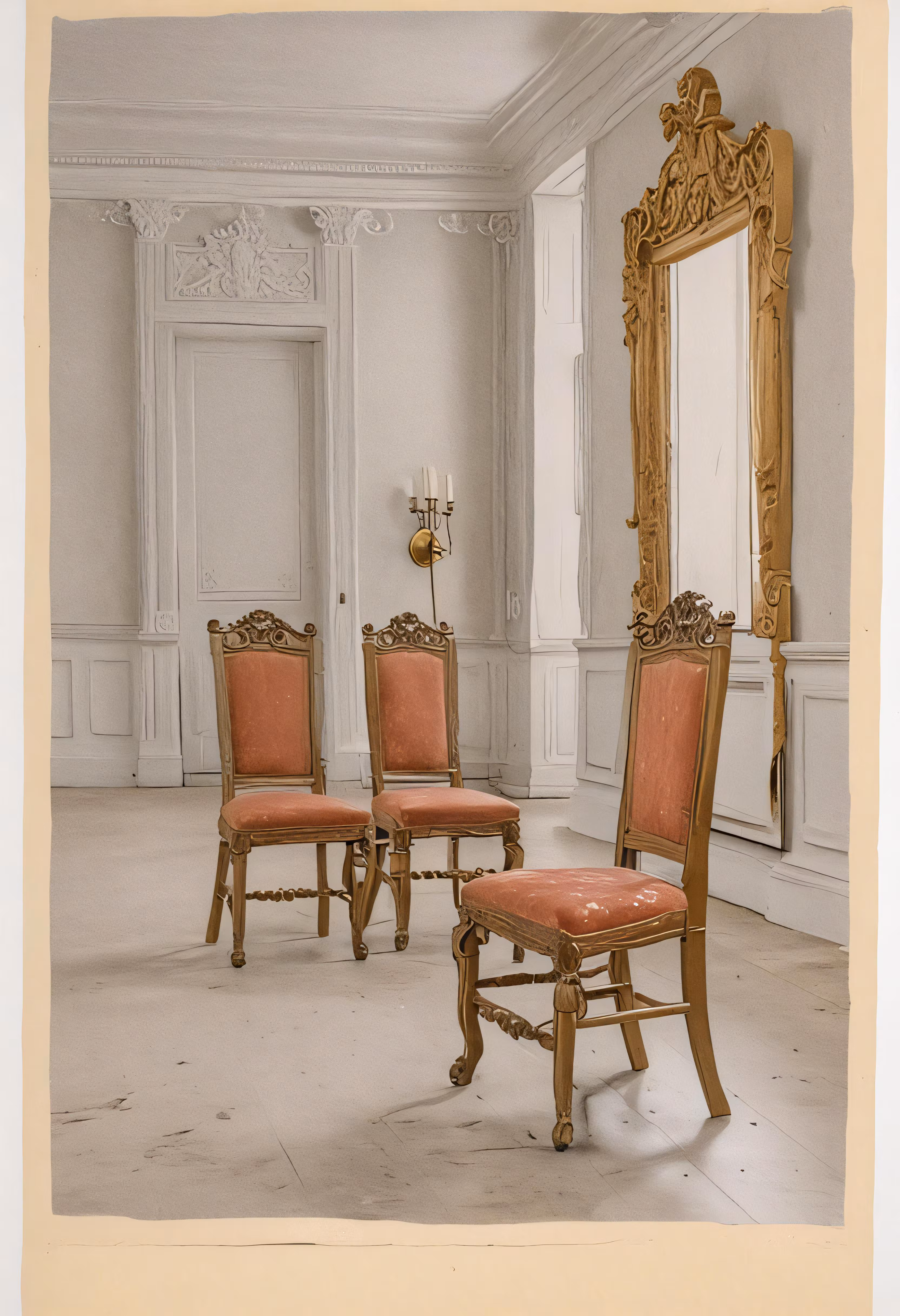 High resolution picture, free to use, there are two red chairs and two gold mirrors