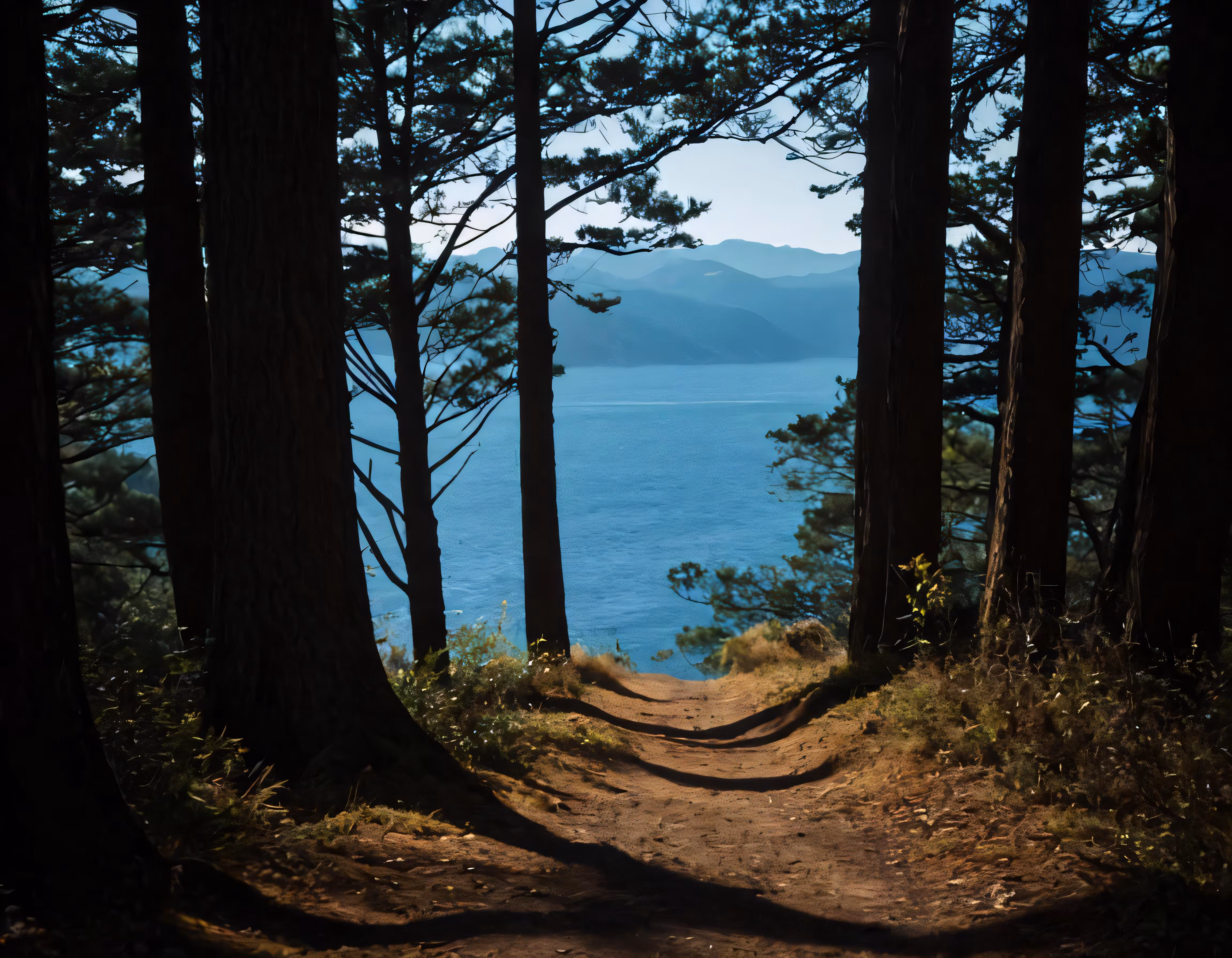 High resolution picture, free to use, there are two trees and an empty path to the water