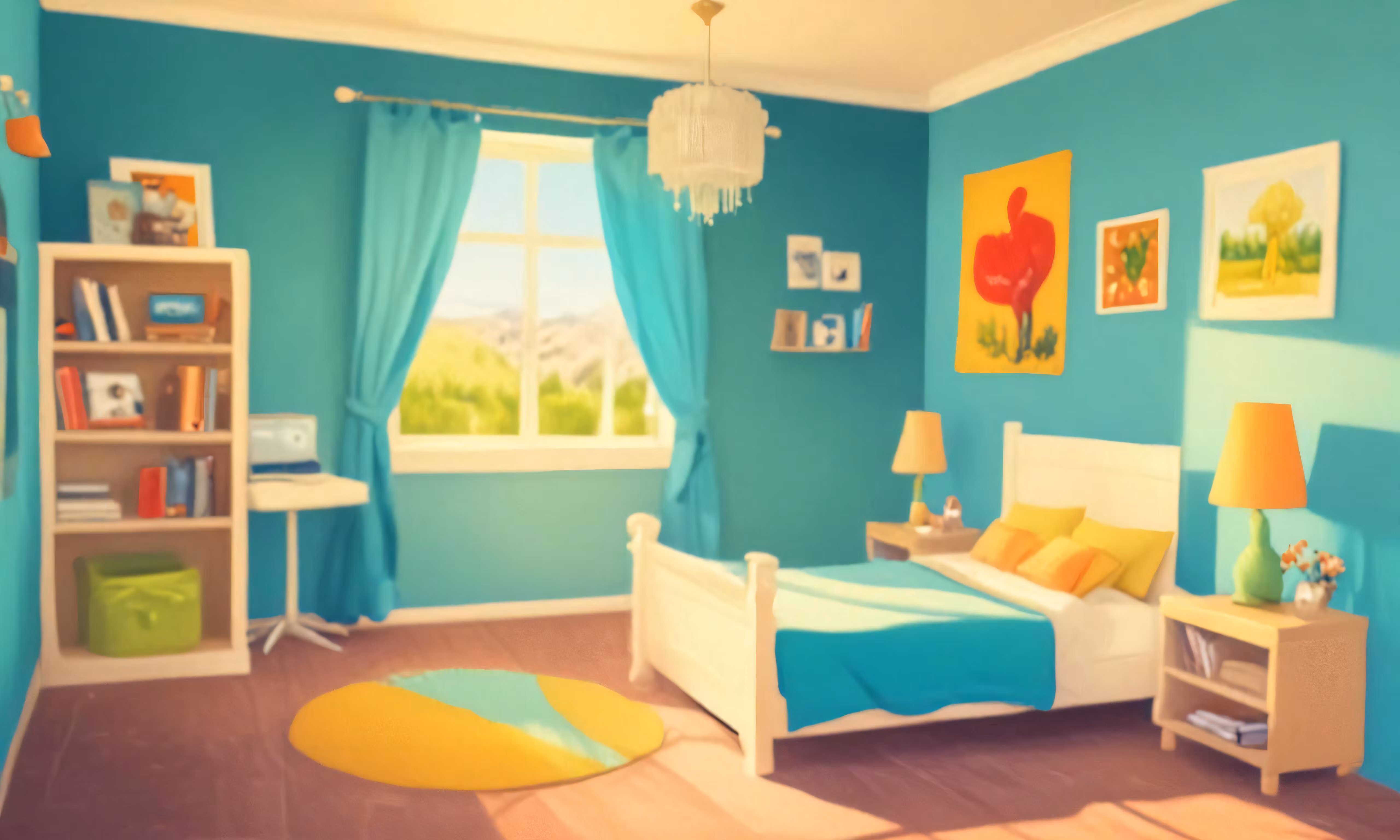 High resolution picture, free to use, there is a blue and white room with a small bed