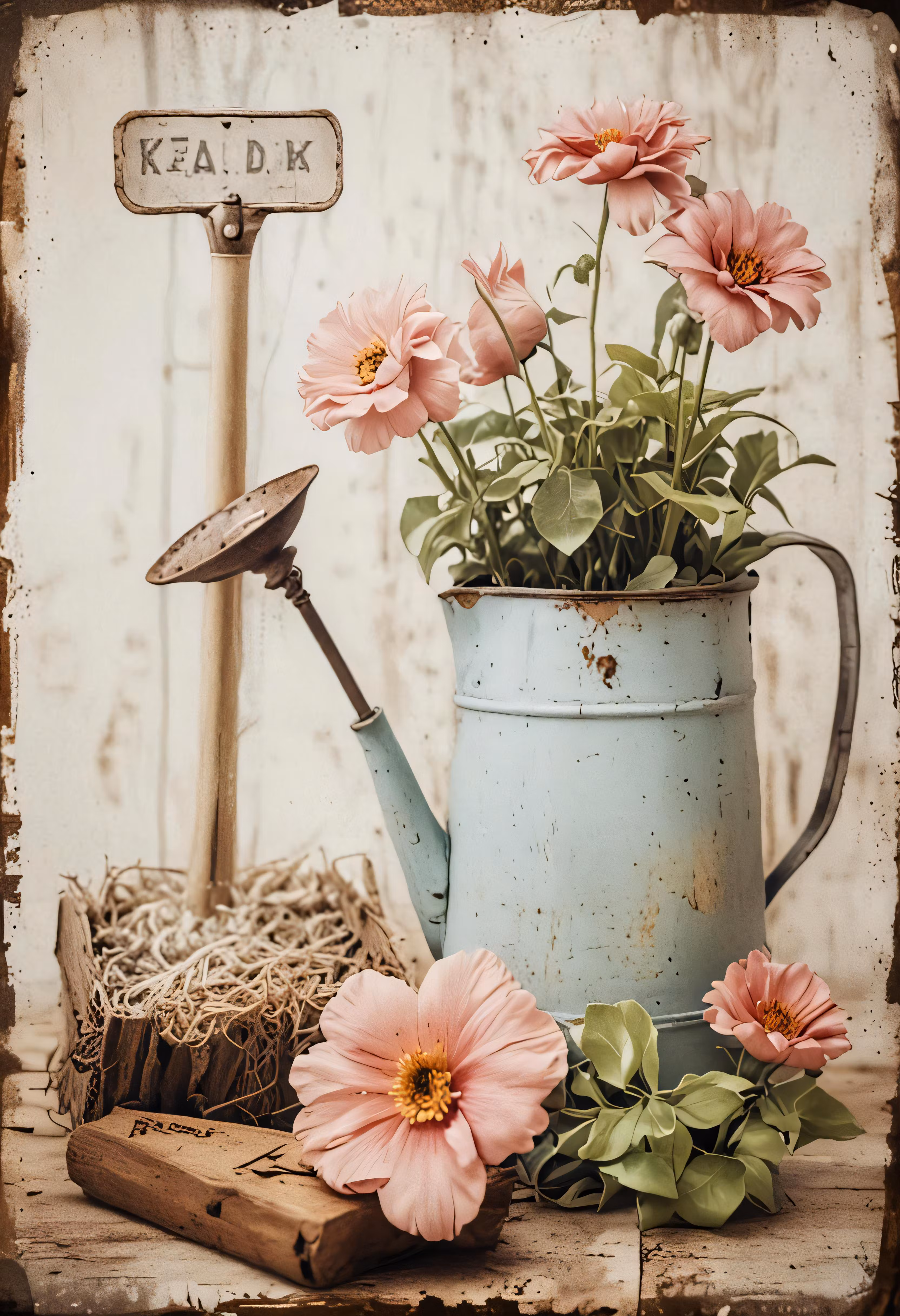 High resolution picture, free to use, there is a bucket of flowers next to a watering can