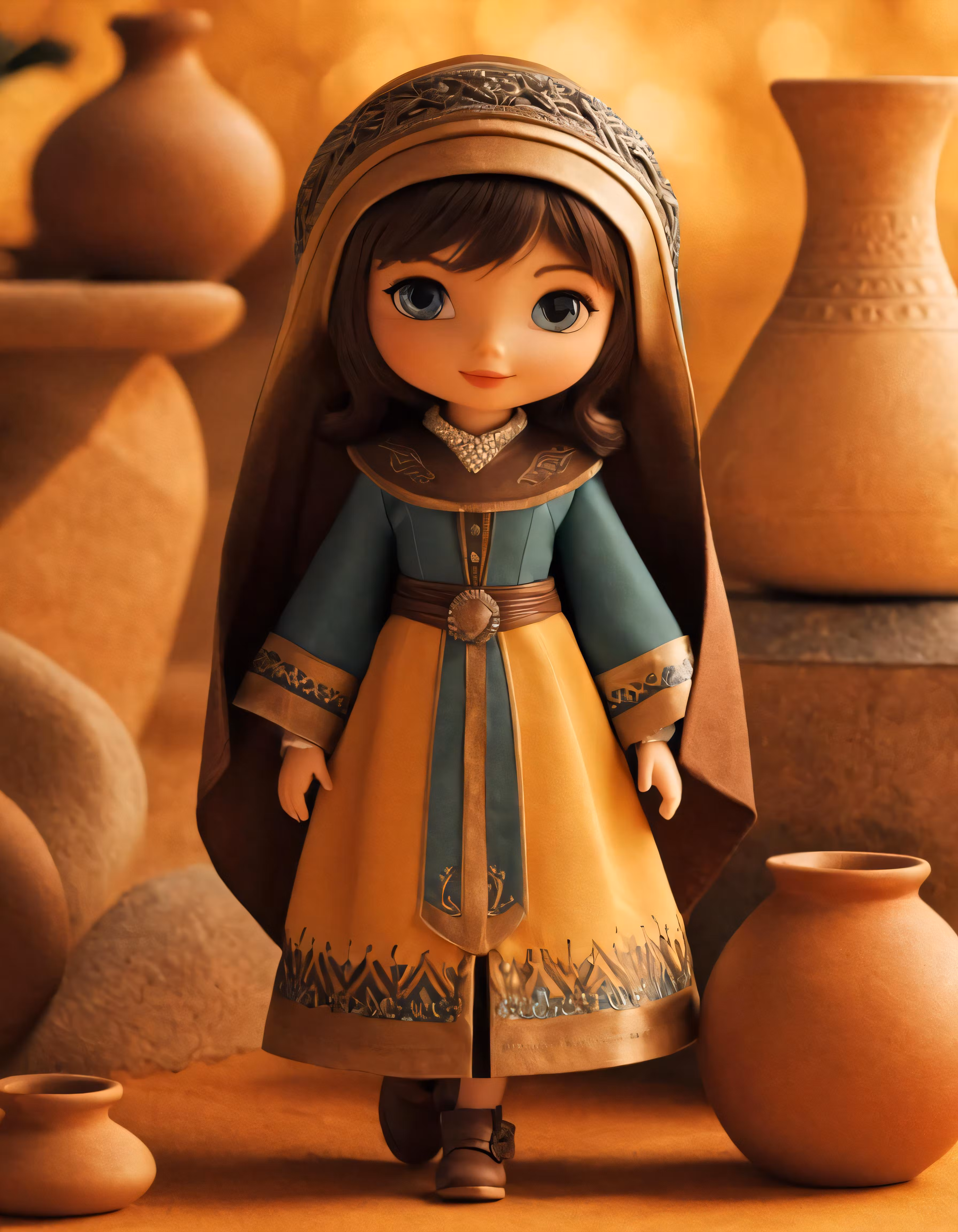 High resolution picture, free to use, there is a doll with a yellow dress next to three vases
