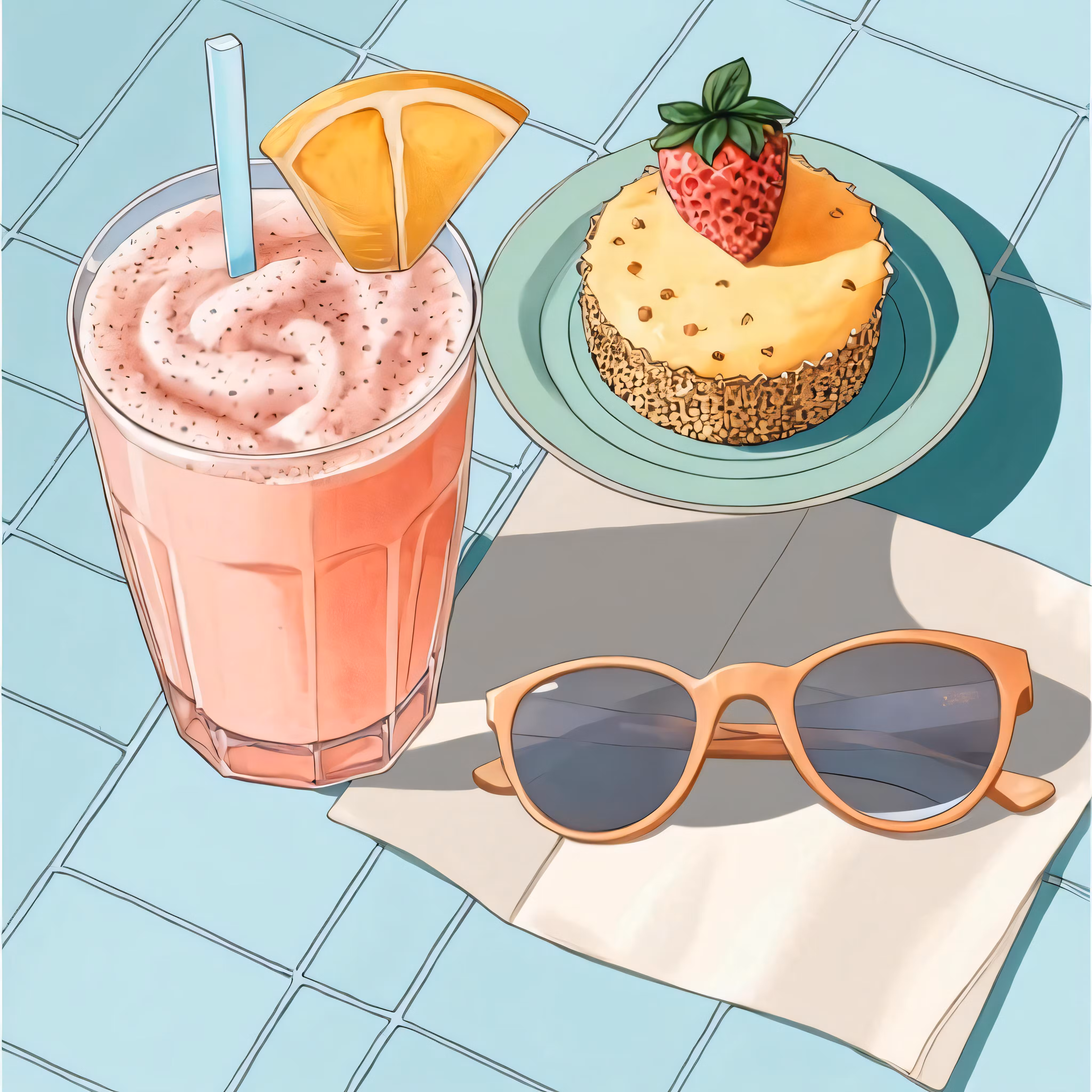 High resolution picture, free to use, there is a fruit and beverage in front of some sunglasses