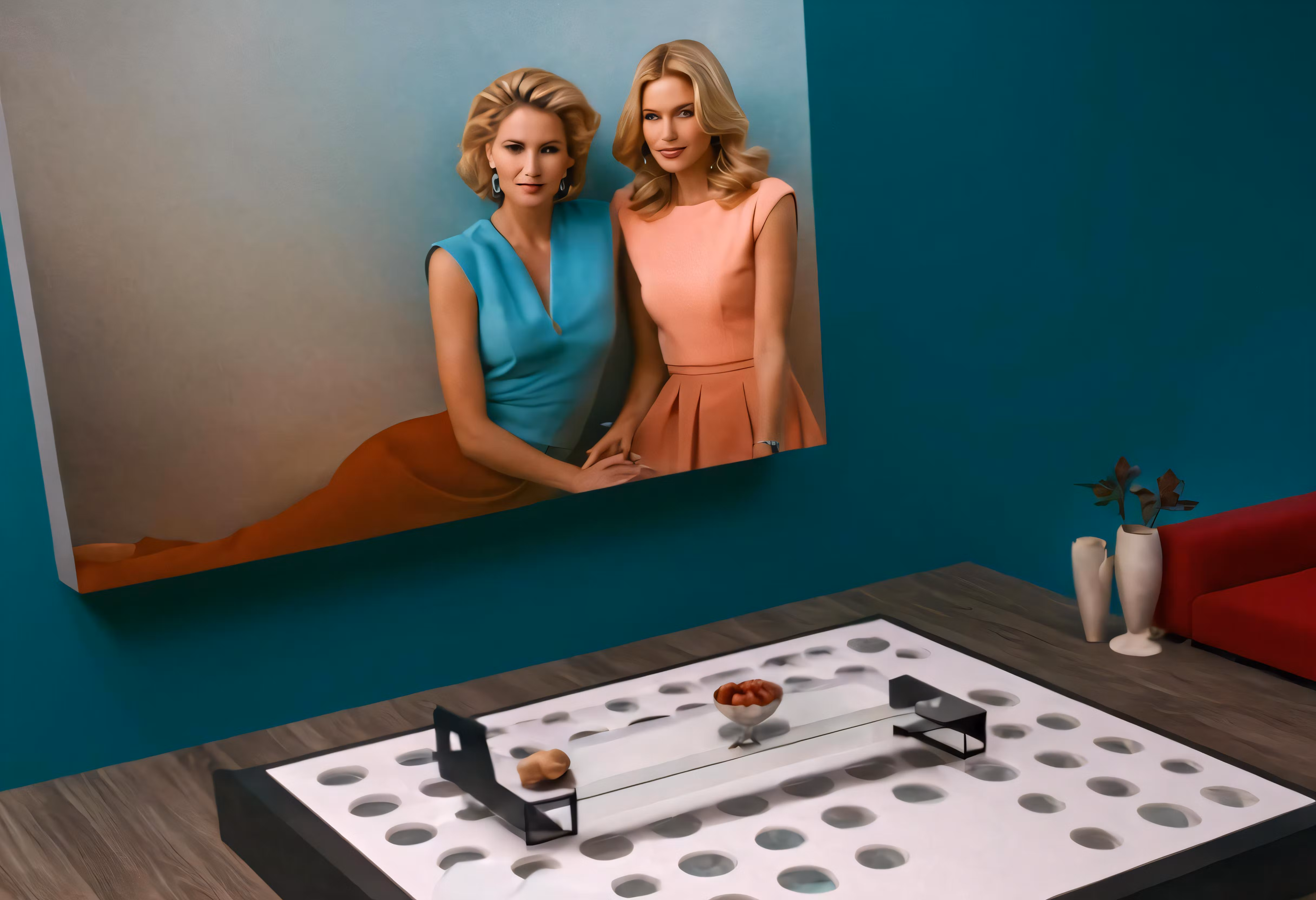 High resolution picture, free to use, there is a painting of two women holding hands behind a glass table