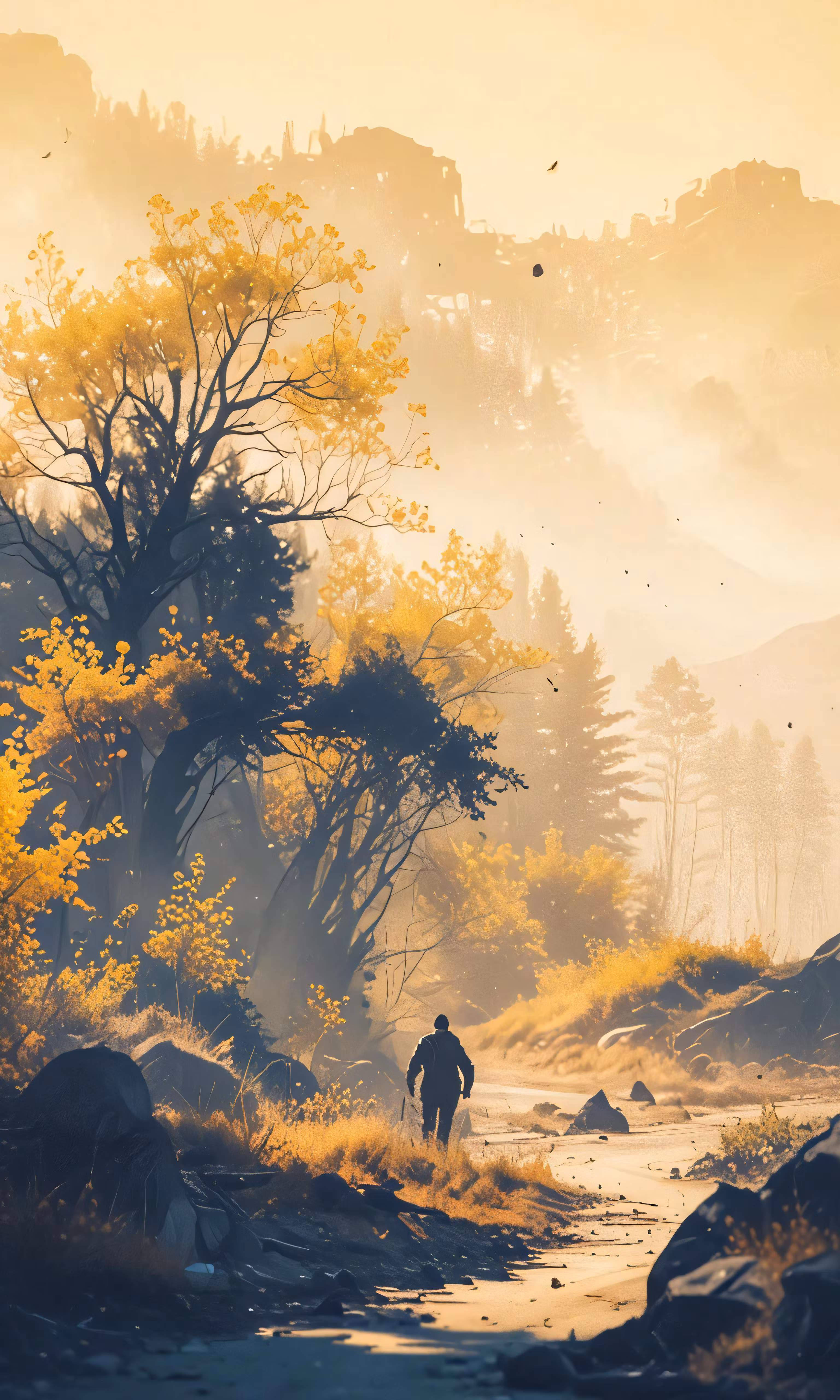 High resolution picture, free to use, there is a person walking down the road on a foggy day