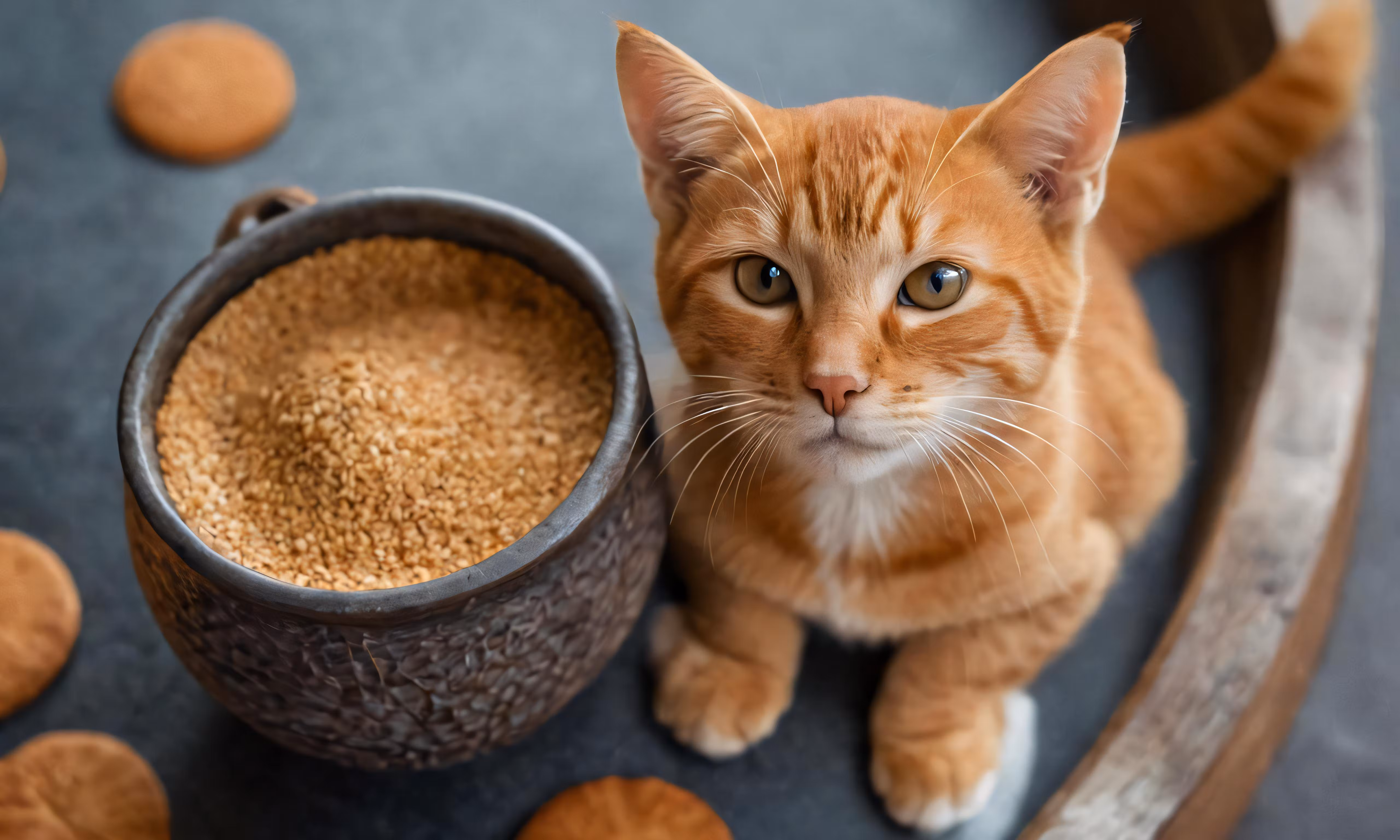 High resolution picture, free to use, there is a small brown cat that is sitting beside a bowl of grain