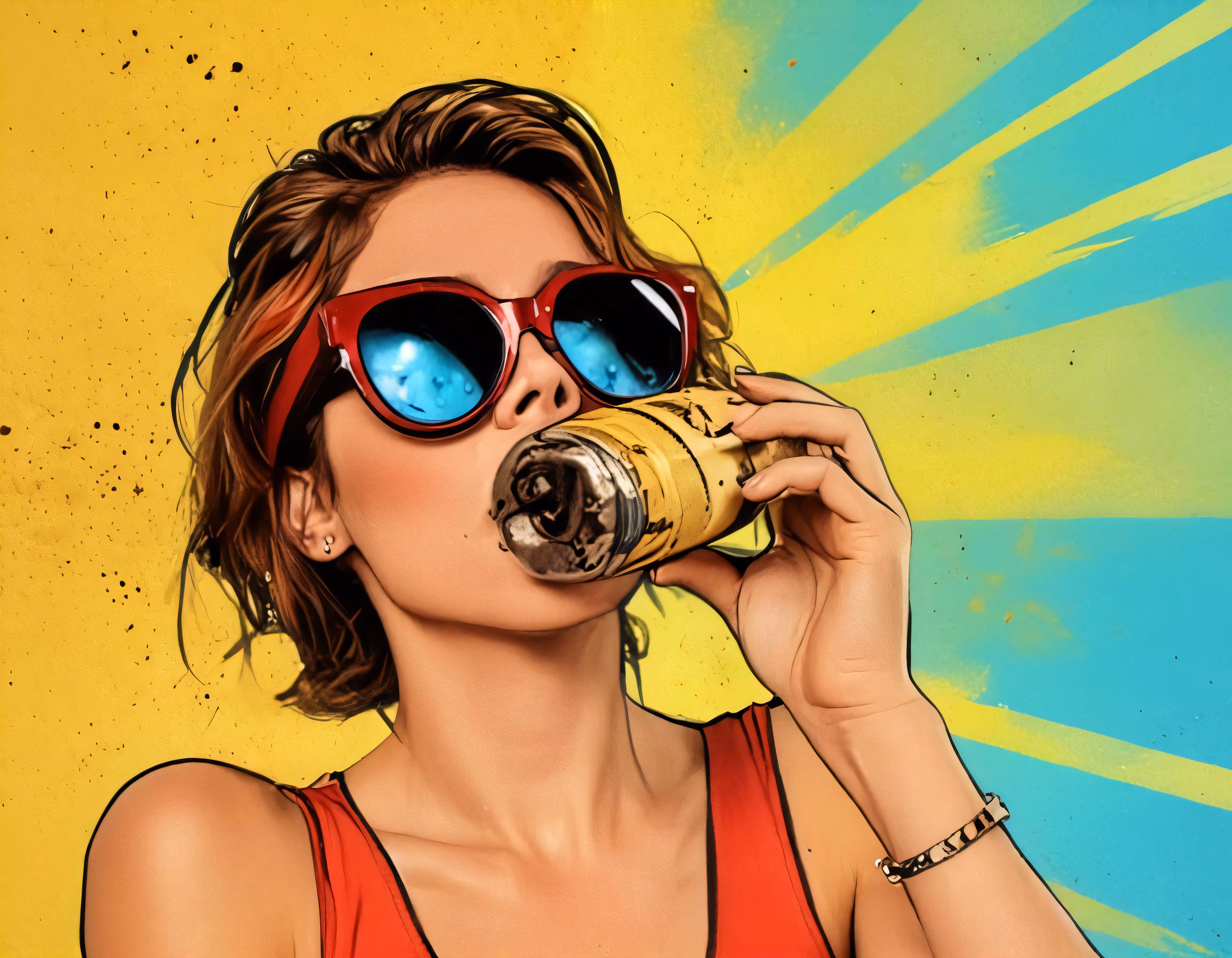High resolution picture, free to use, there is a woman with shades and drinking from a can