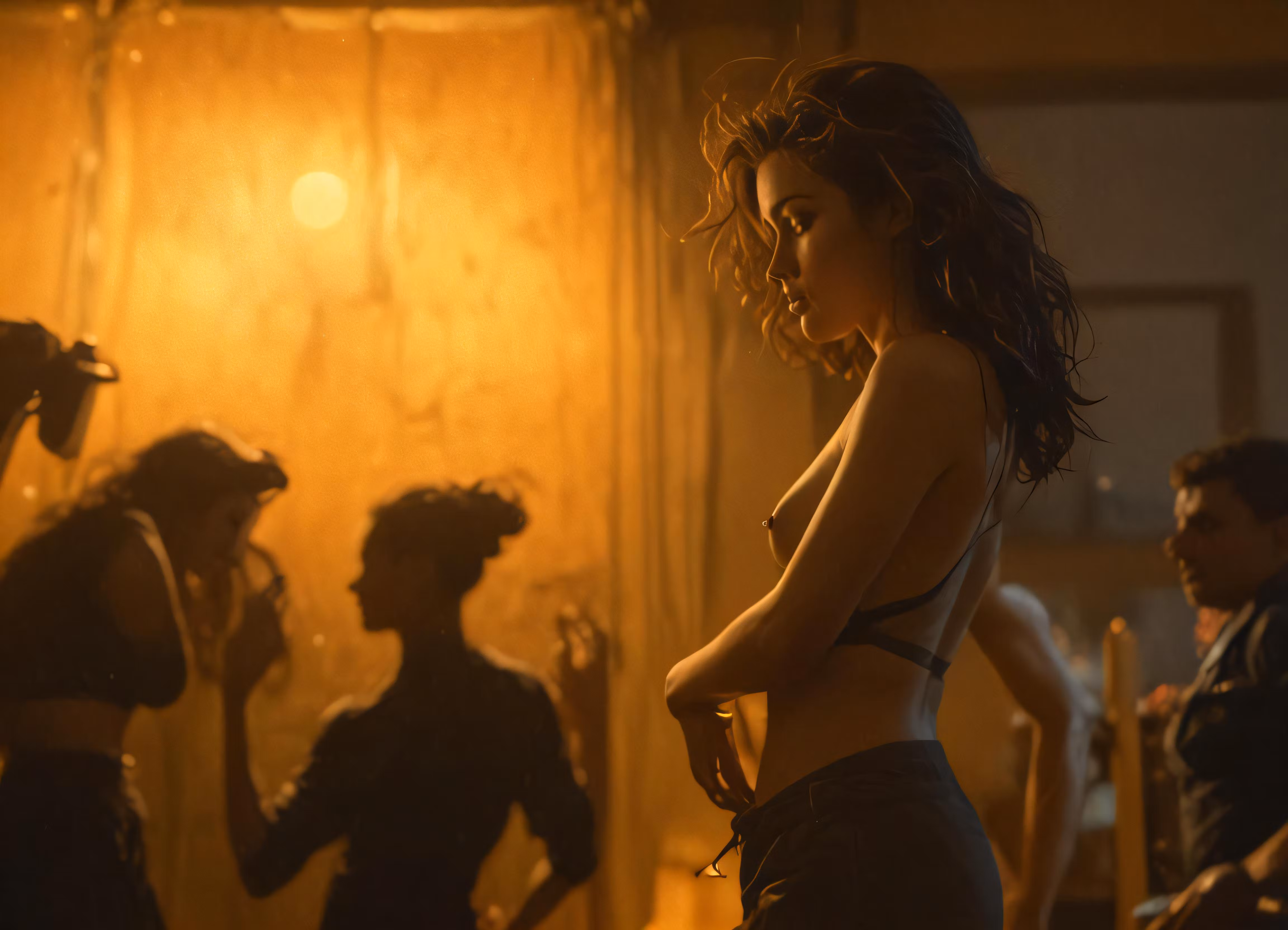 High resolution picture, free to use, there is a woman with very high waist standing in a room full of people