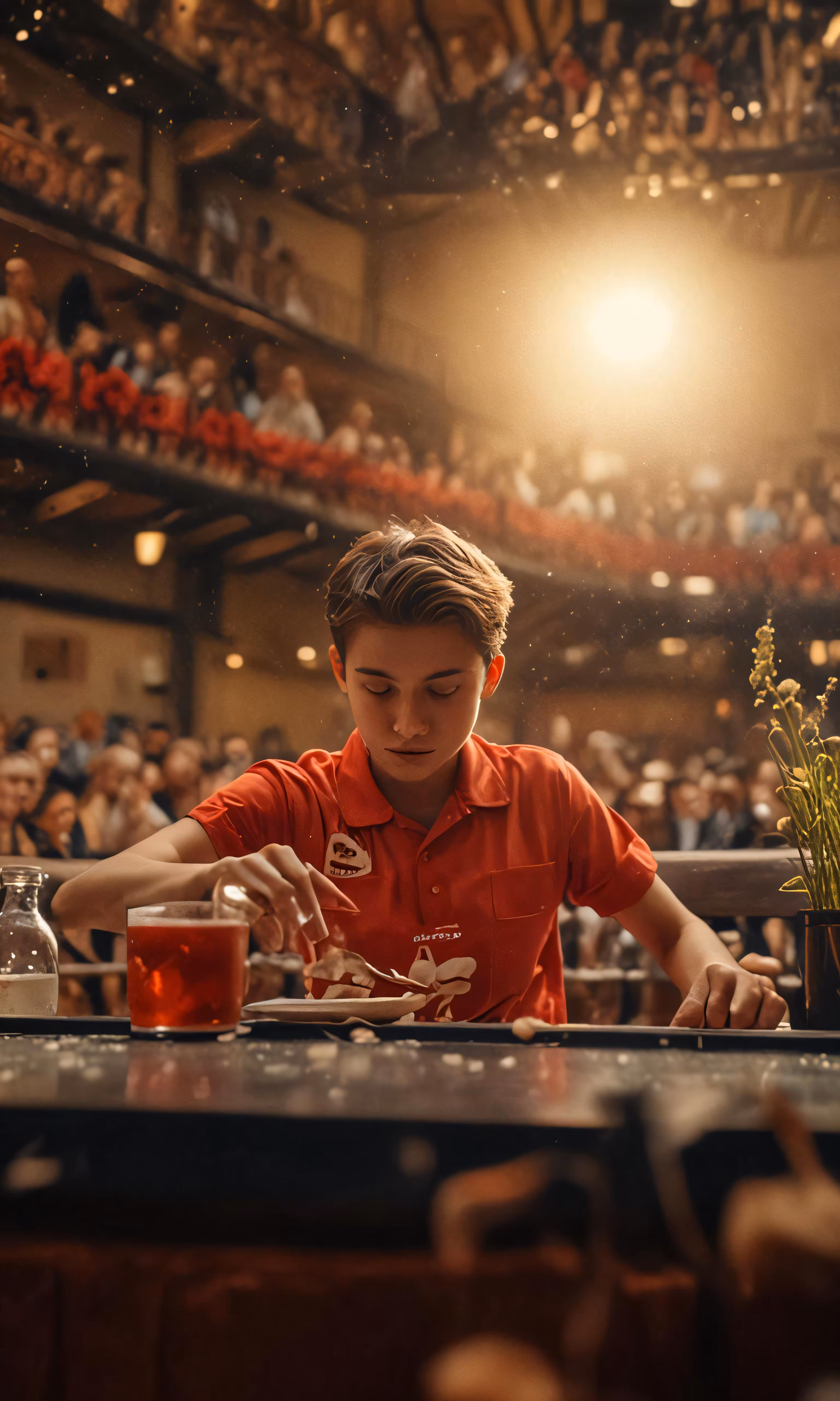 High resolution picture, free to use, there is a young man in a red shirt looking at a sandwich
