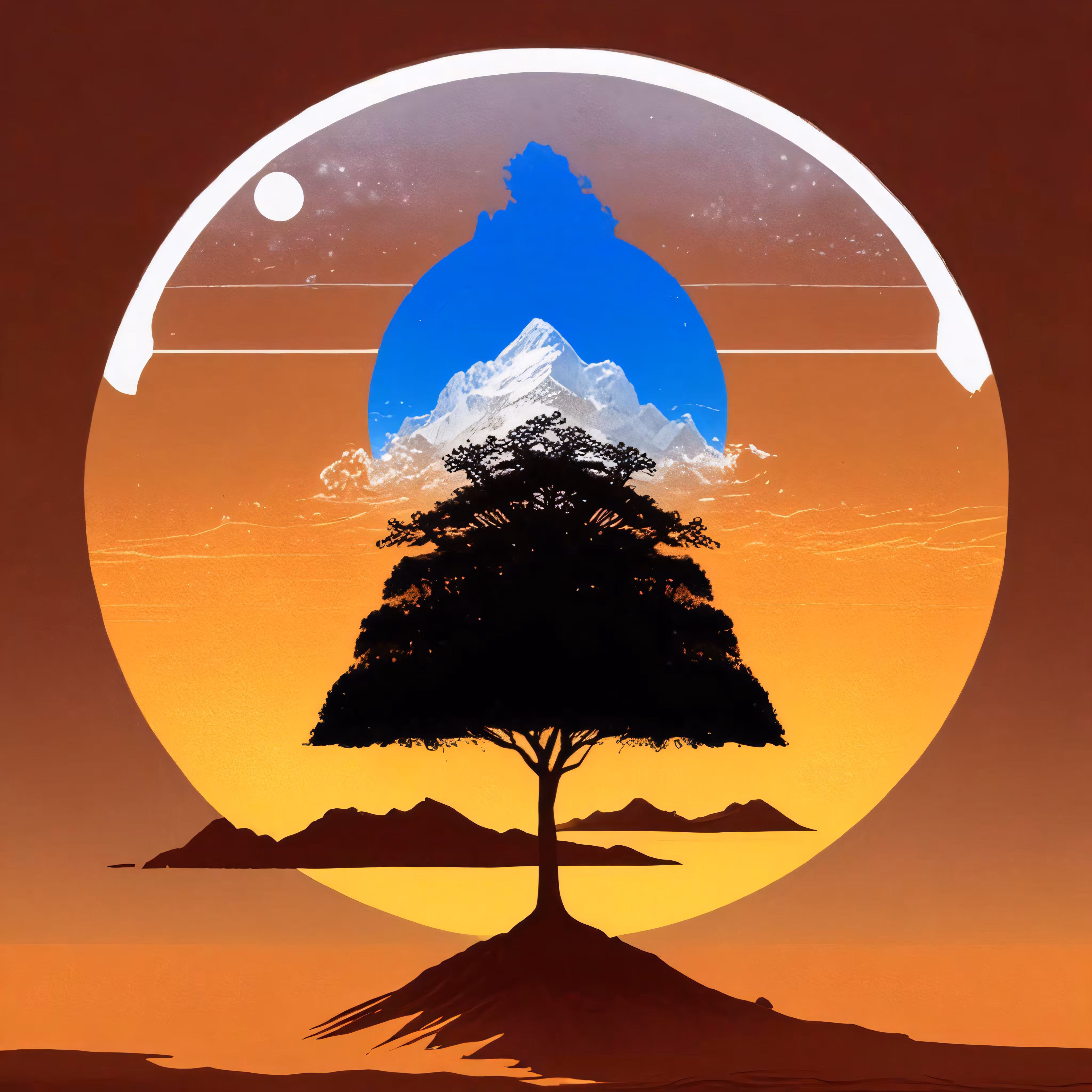 High resolution picture, free to use, there is an illustration with a tree and mountains