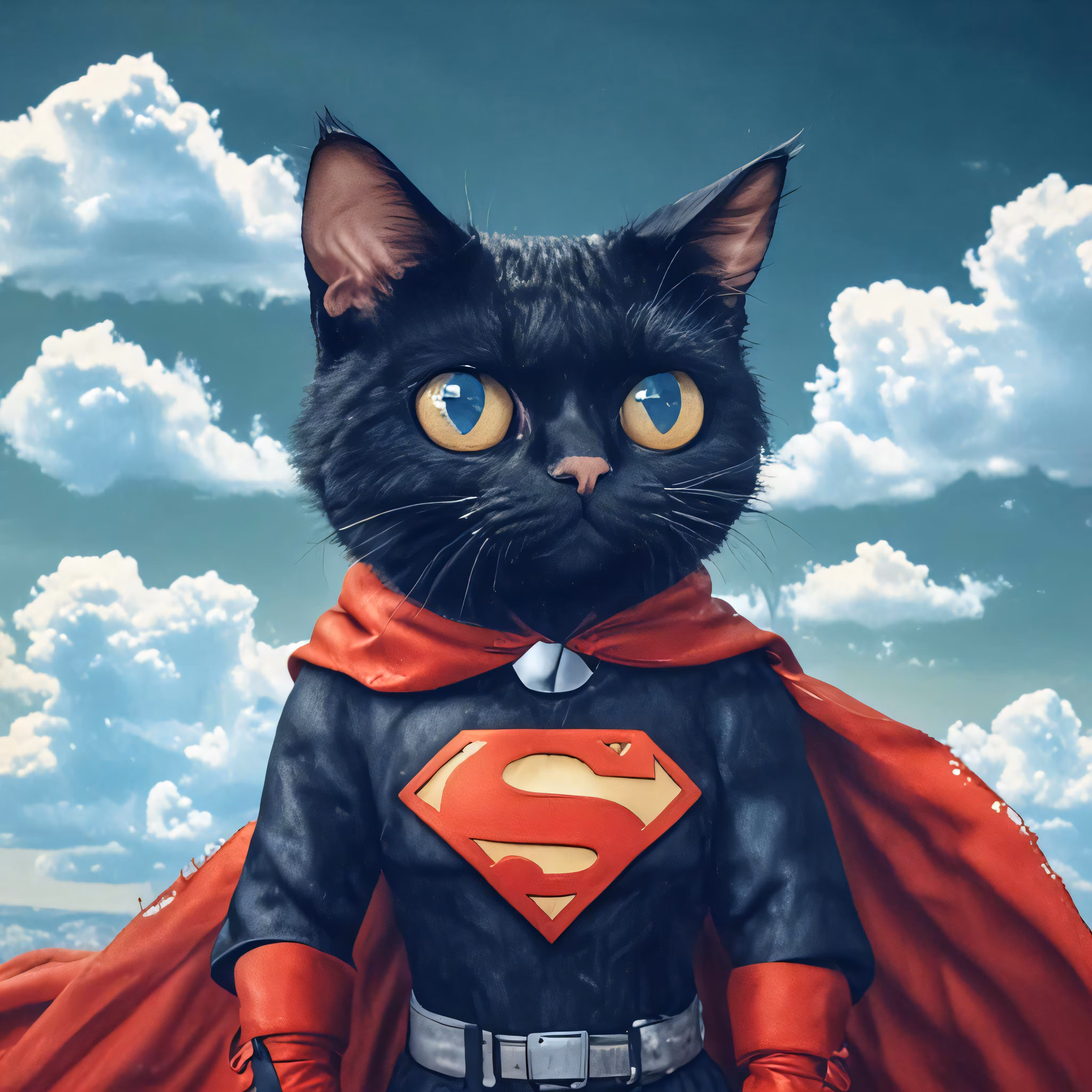 High resolution picture, free to use, this black cat is dressed as superman on the blue sky