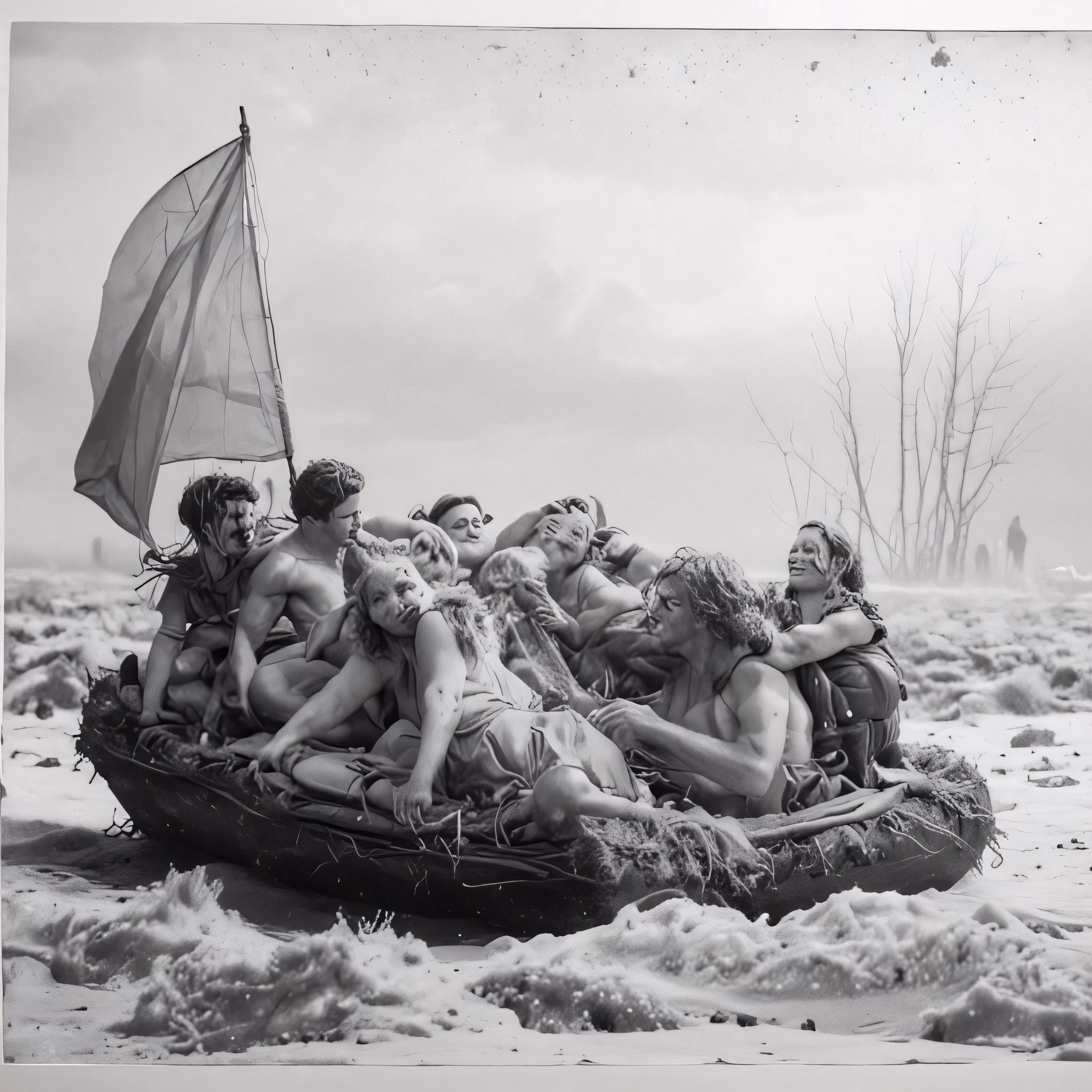 High resolution picture, free to use, this is an old photo of a group of women riding a raft down a river