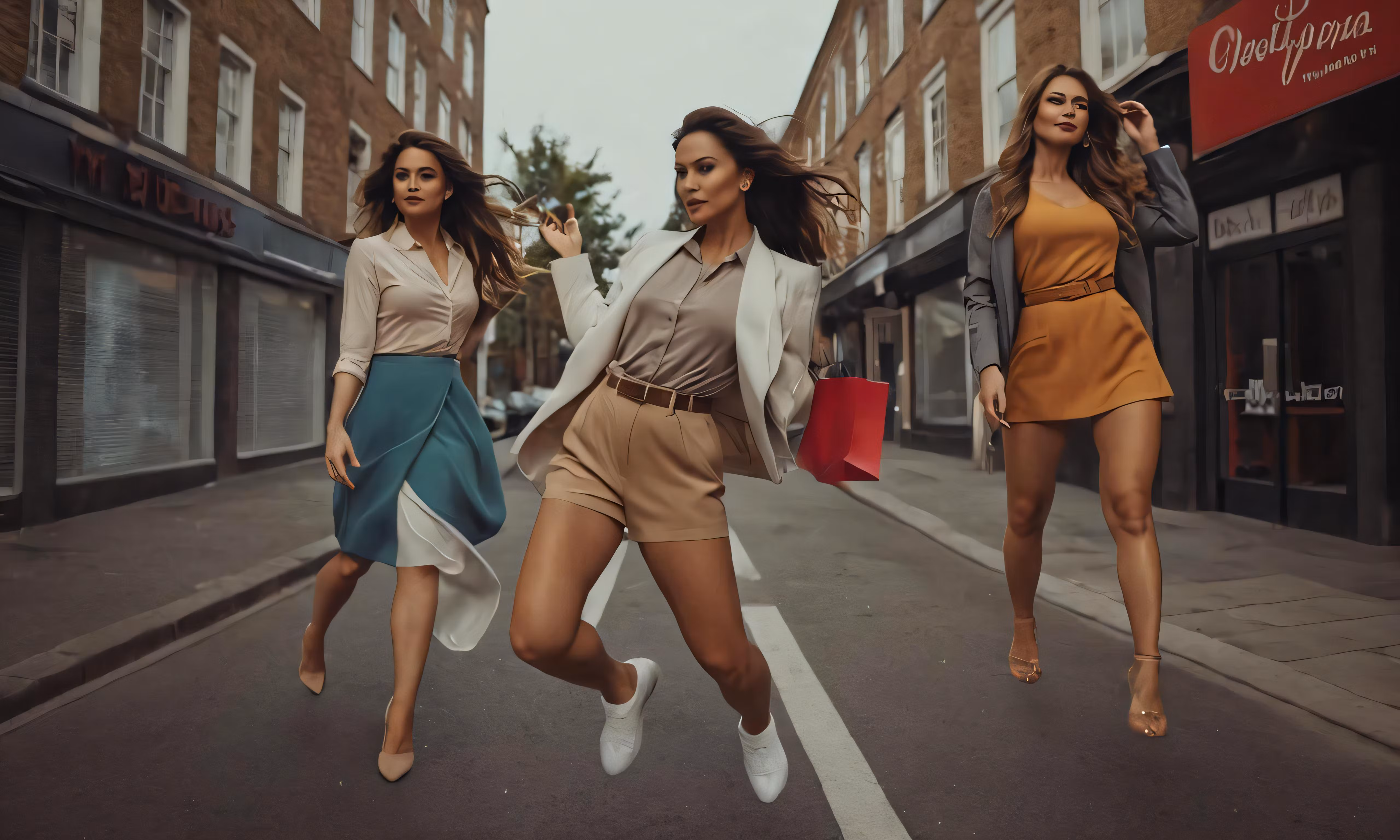 High resolution picture, free to use, three beautiful young women dressed in brown clothing running across the street