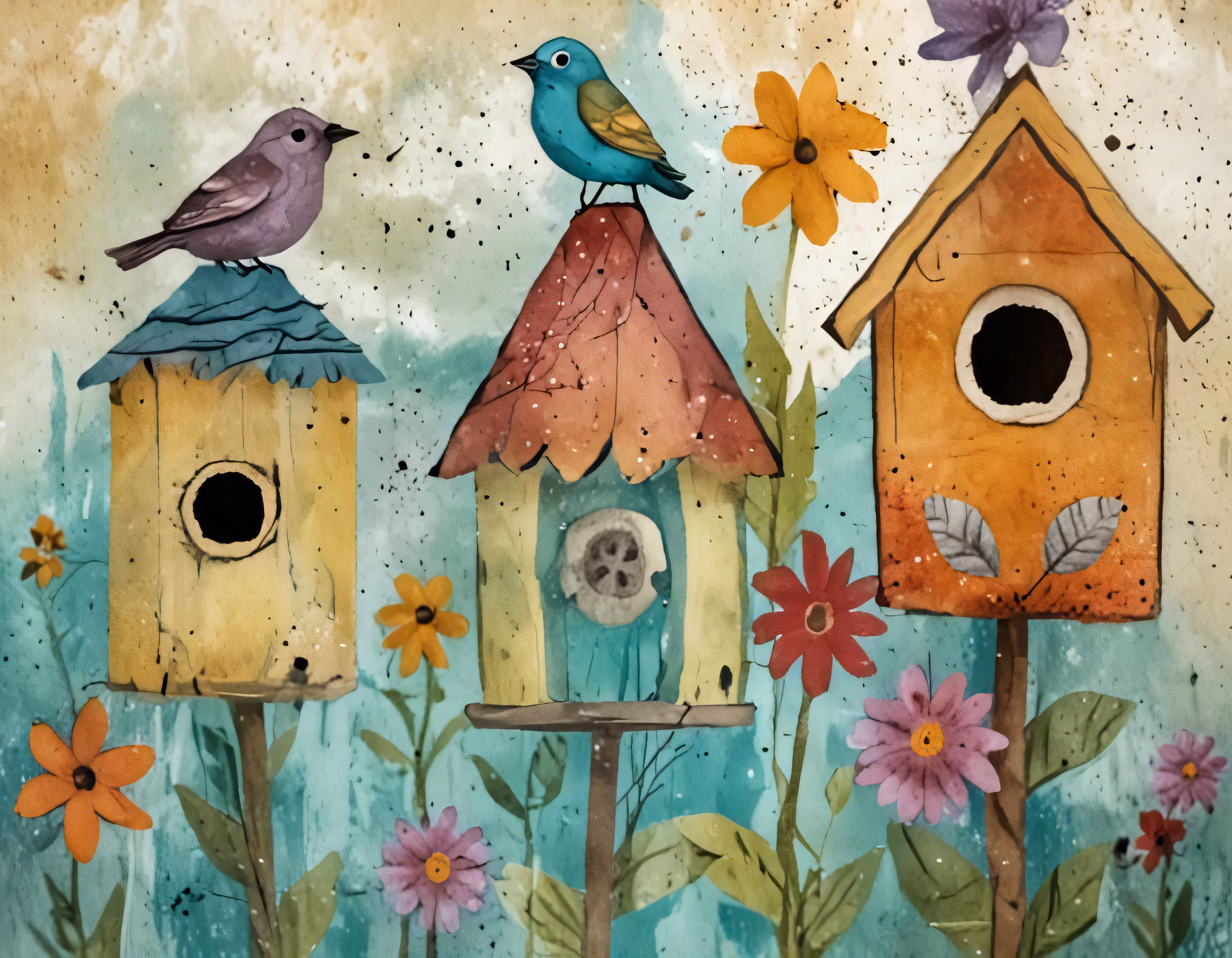 High resolution picture, free to use, three birds and two colorful houses with flowers