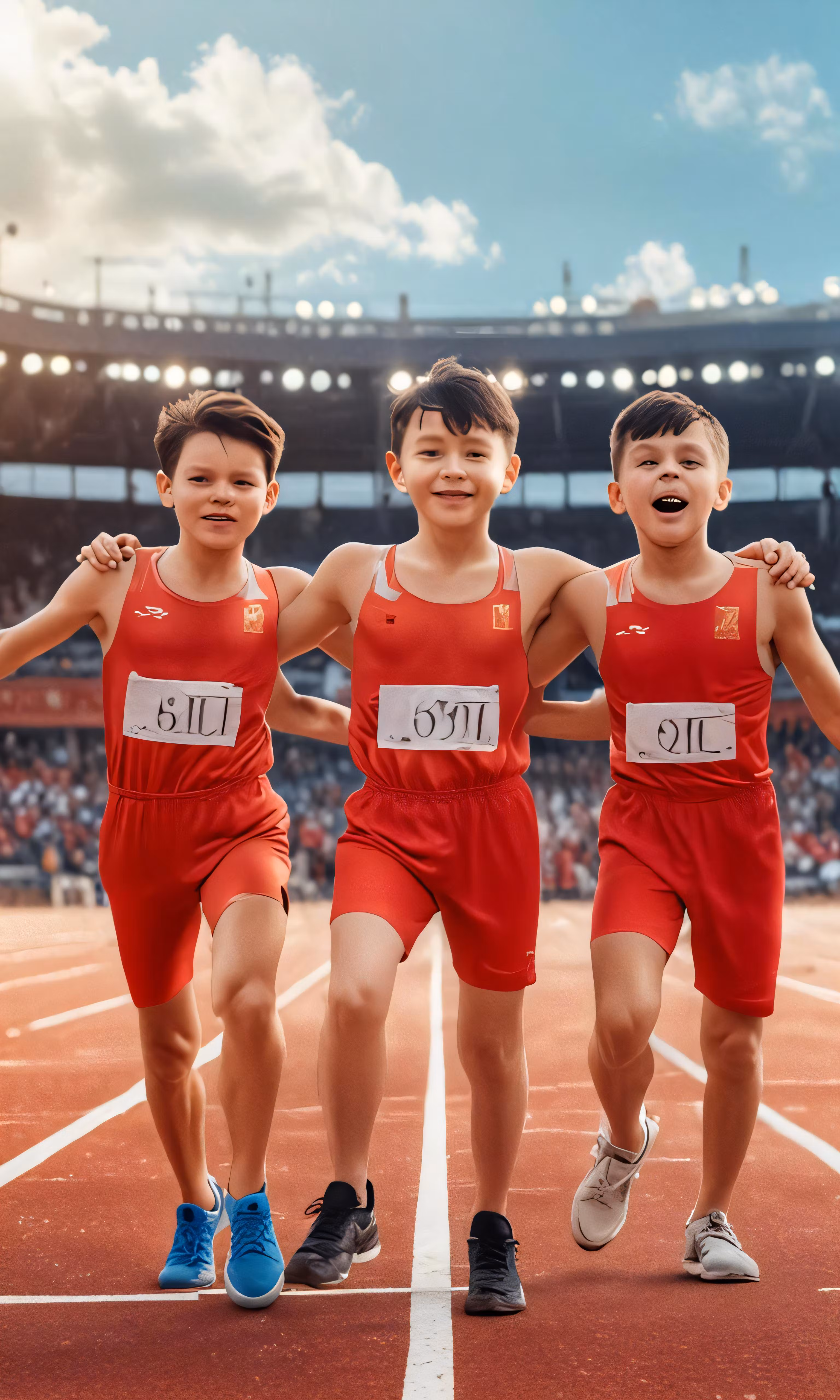 High resolution picture, free to use, three boys wearing red running suits on a race track