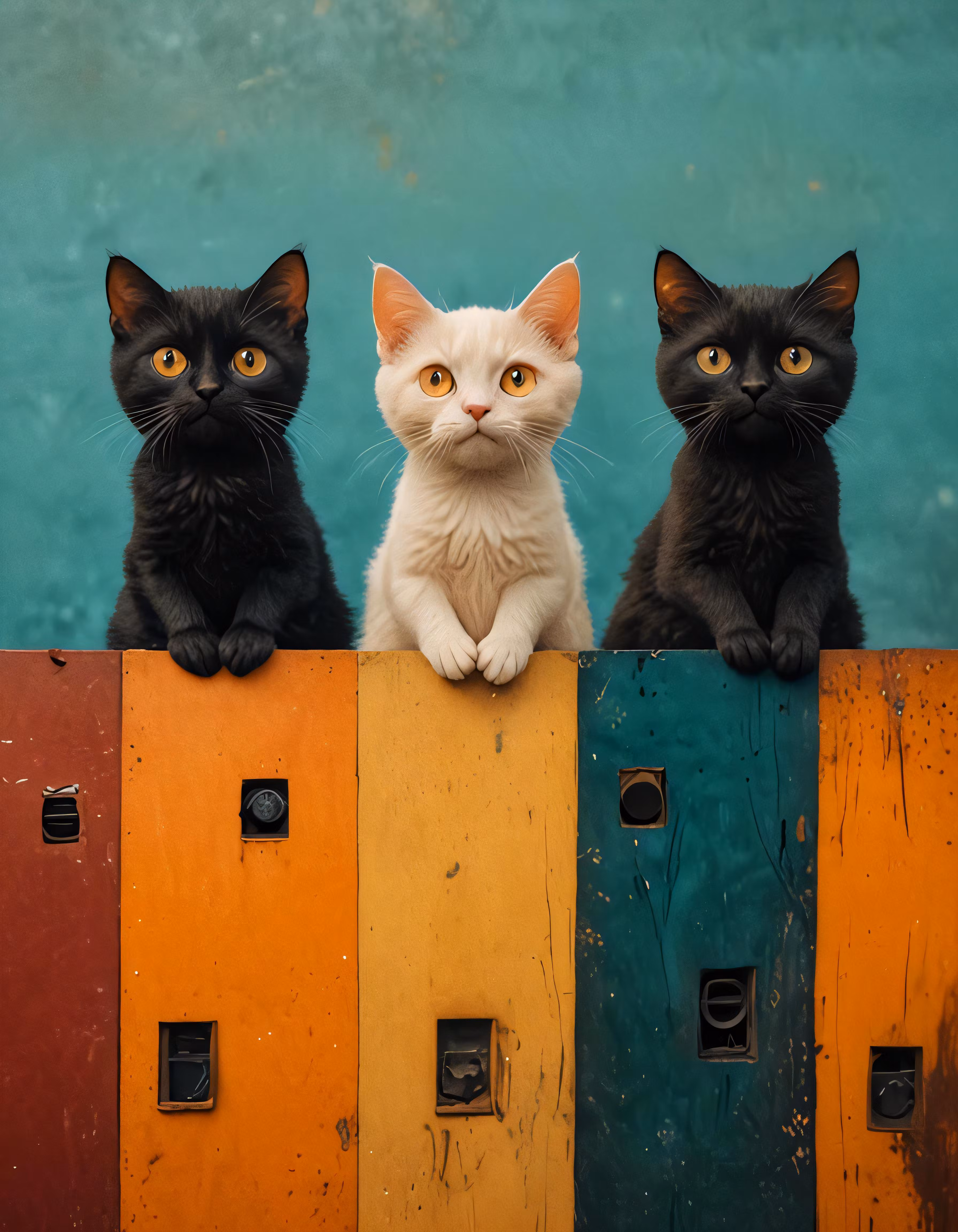 High resolution picture, free to use, three cats sitting on top of different colored blocks