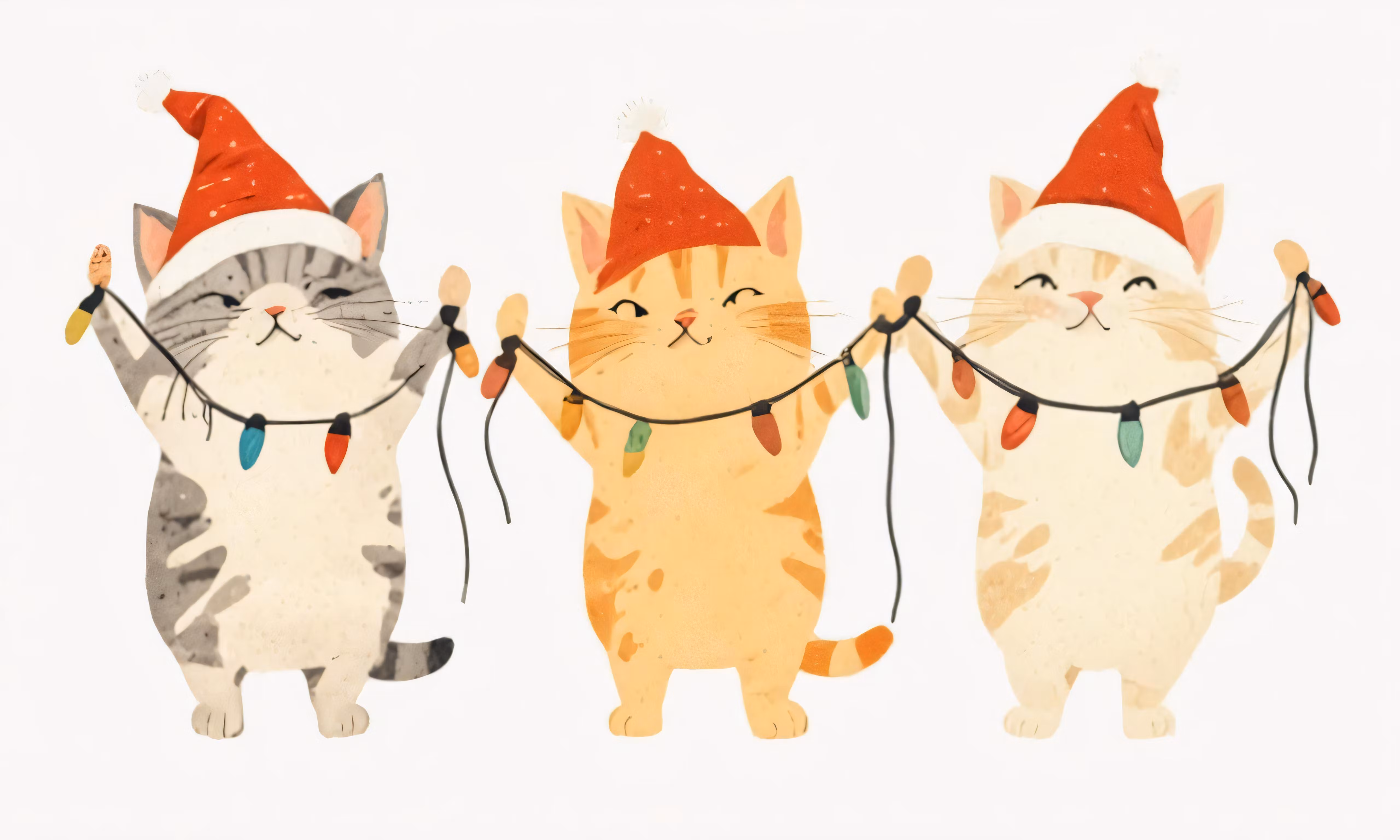 High resolution picture, free to use, three cats with hats and lights are holding on to a string