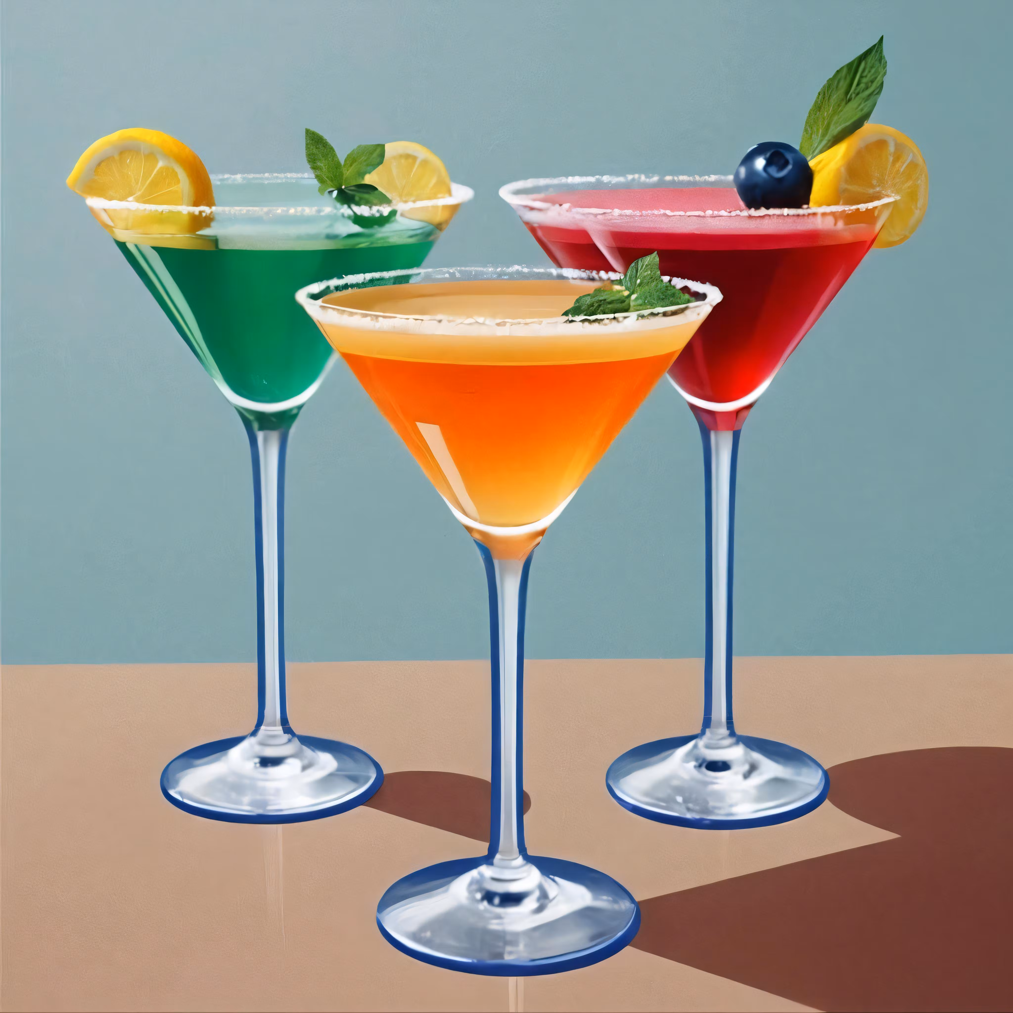 High resolution picture, free to use, three cocktail glasses with different colored drinks in them