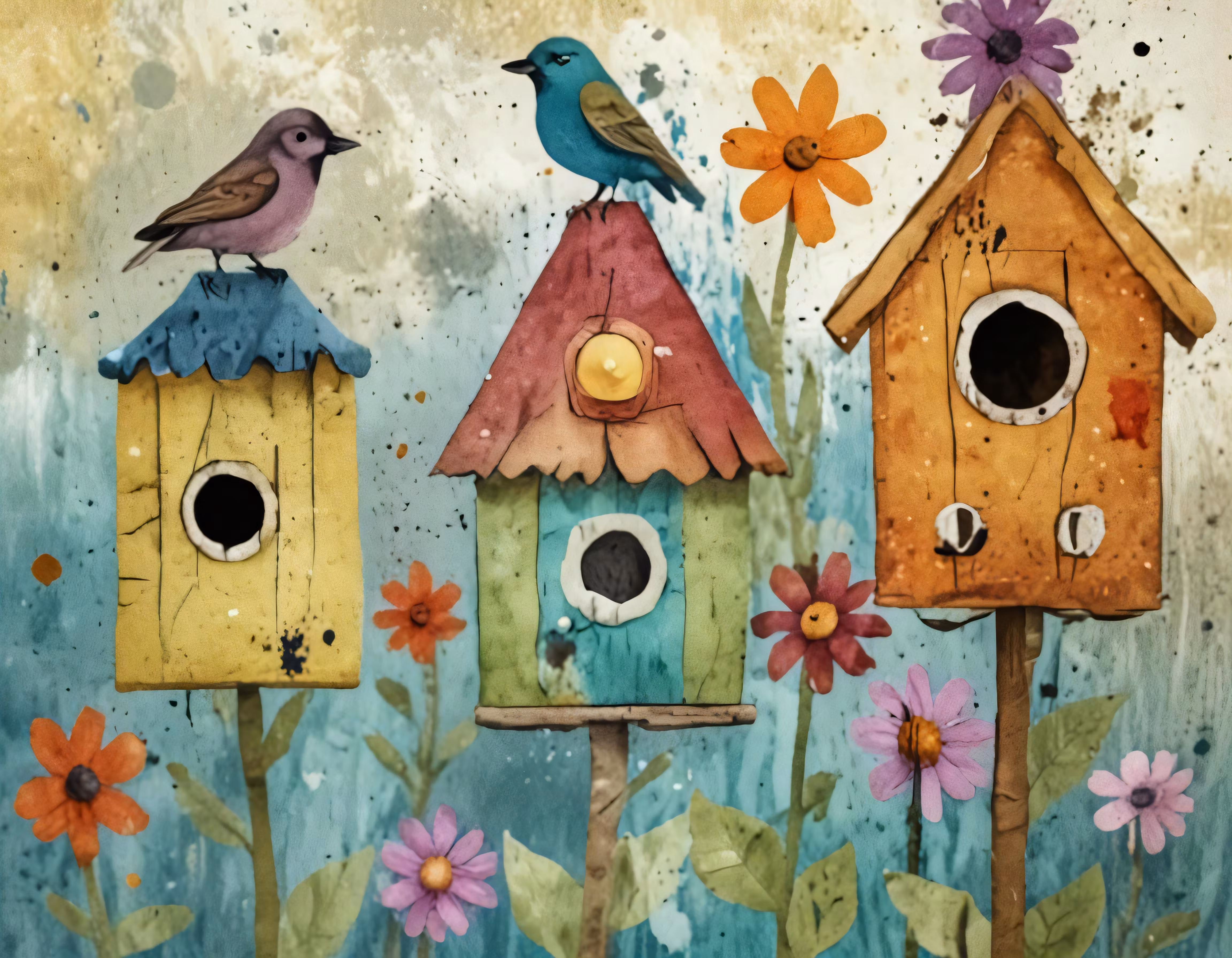 High resolution picture, free to use, three colorful bird houses painted on a canvas