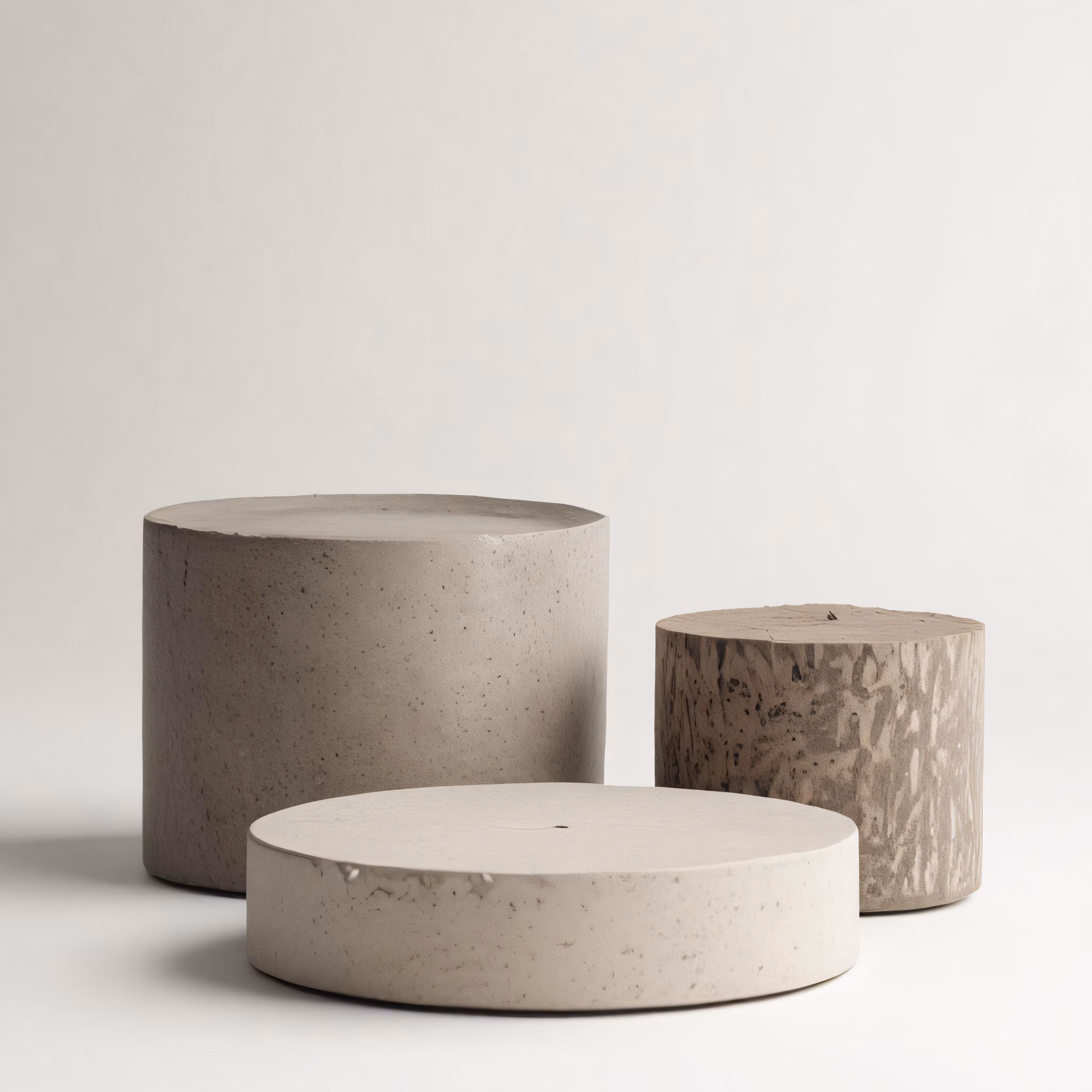 High resolution picture, free to use, three concrete cylinders with different designs, each on a pedestal