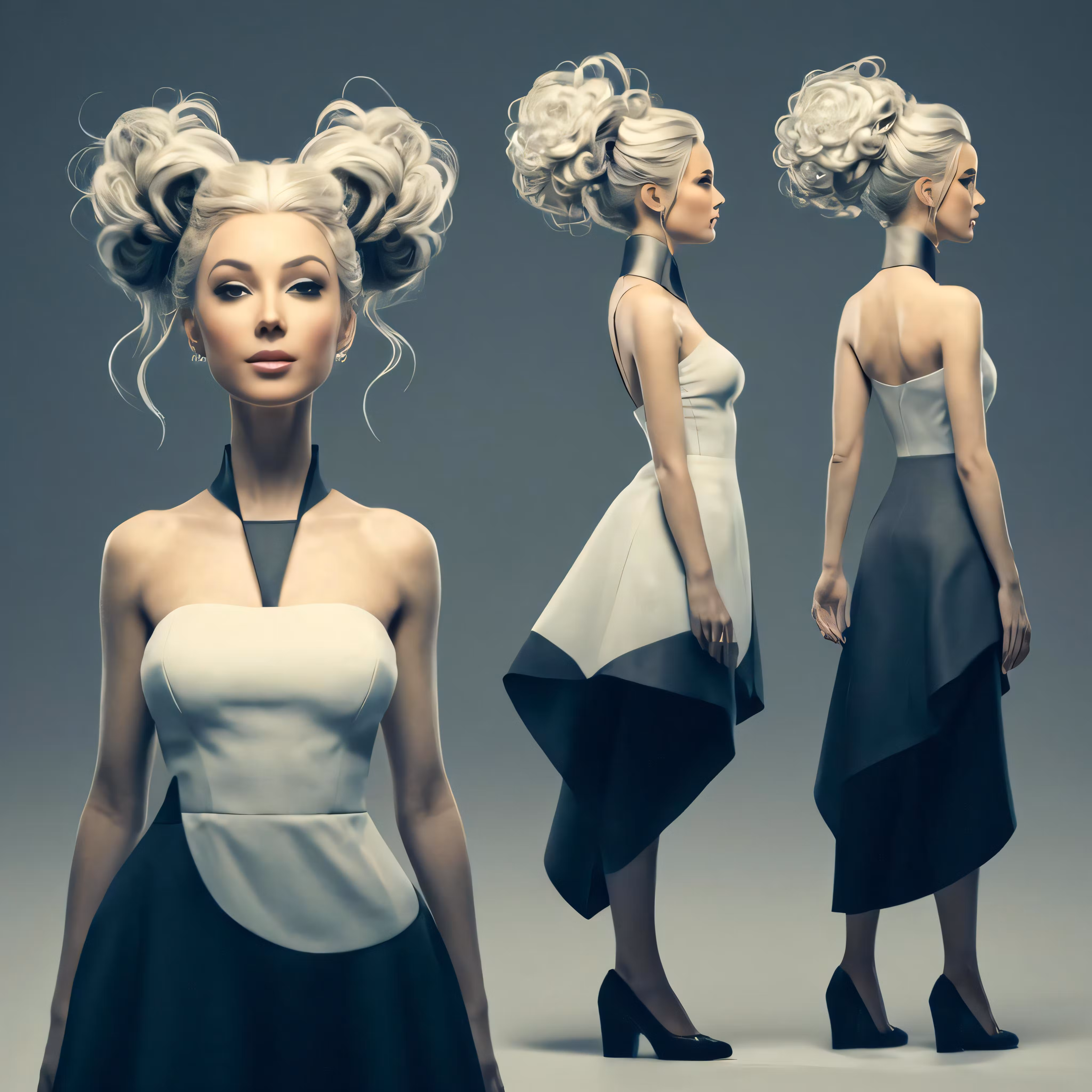 High resolution picture, free to use, three different views of a woman wearing a black and white dress
