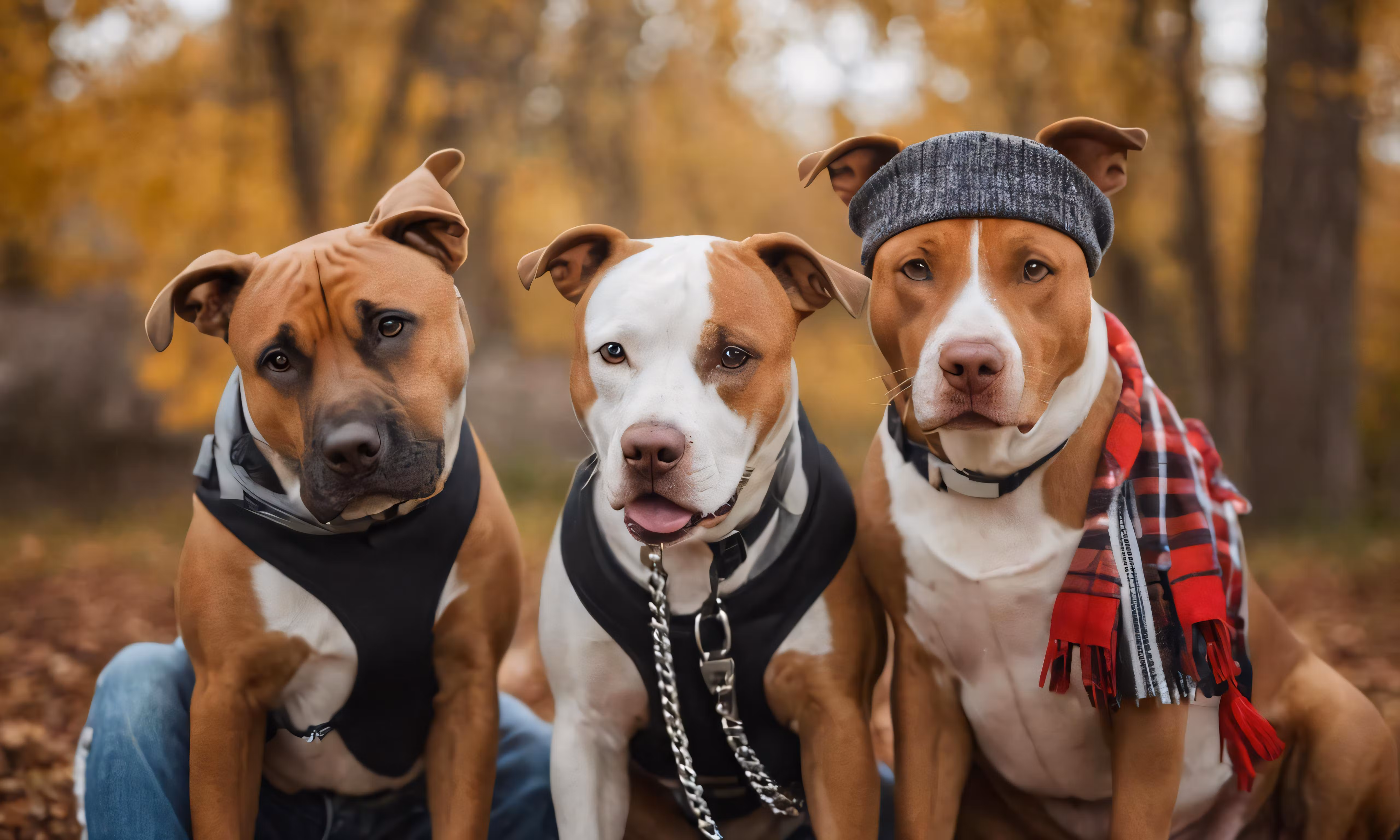High resolution picture, free to use, three dogs with coats and bandanas are sitting next to each other