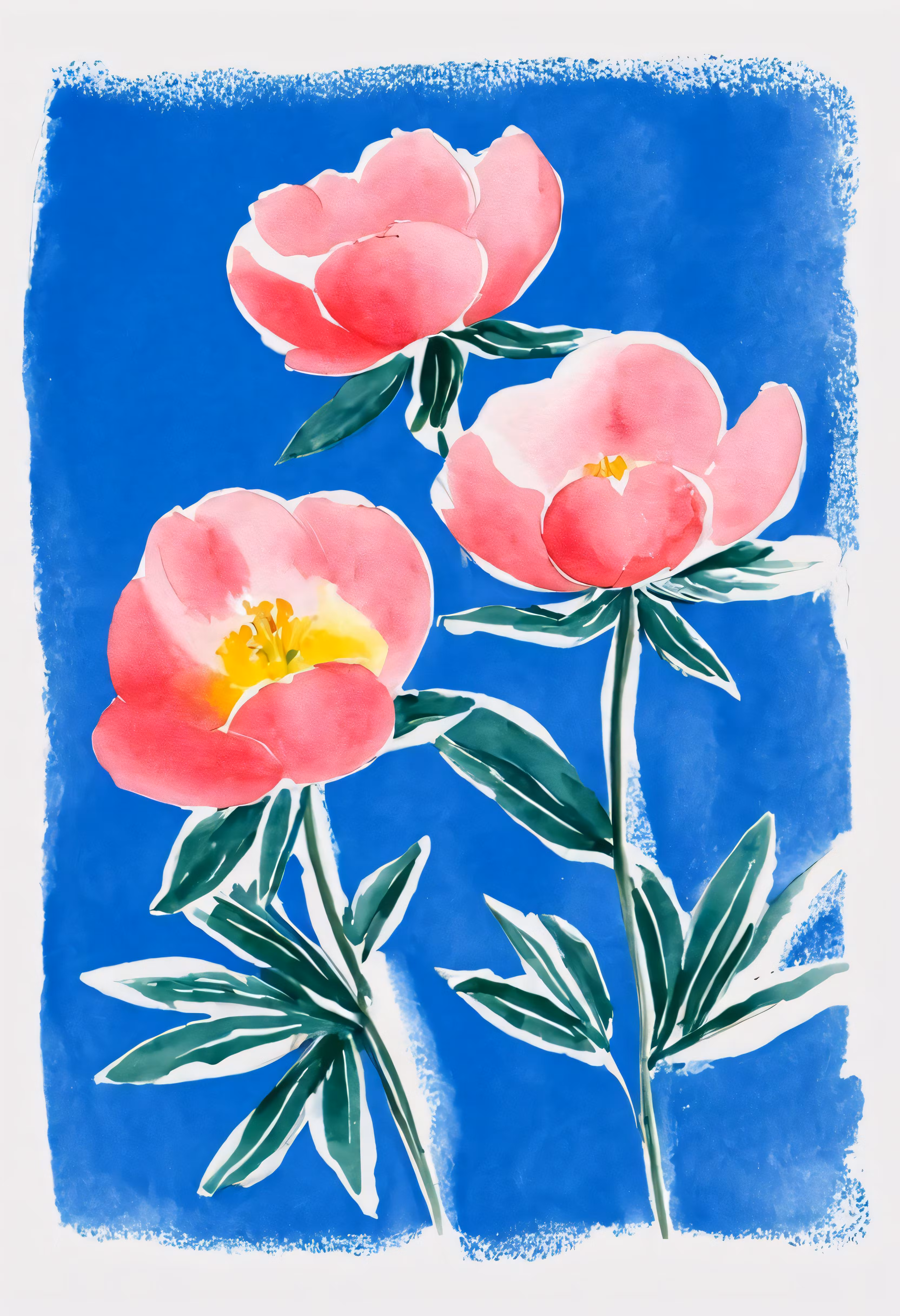 High resolution picture, free to use, three flowers, pink with yellow center, with green leaves, on a blue background
