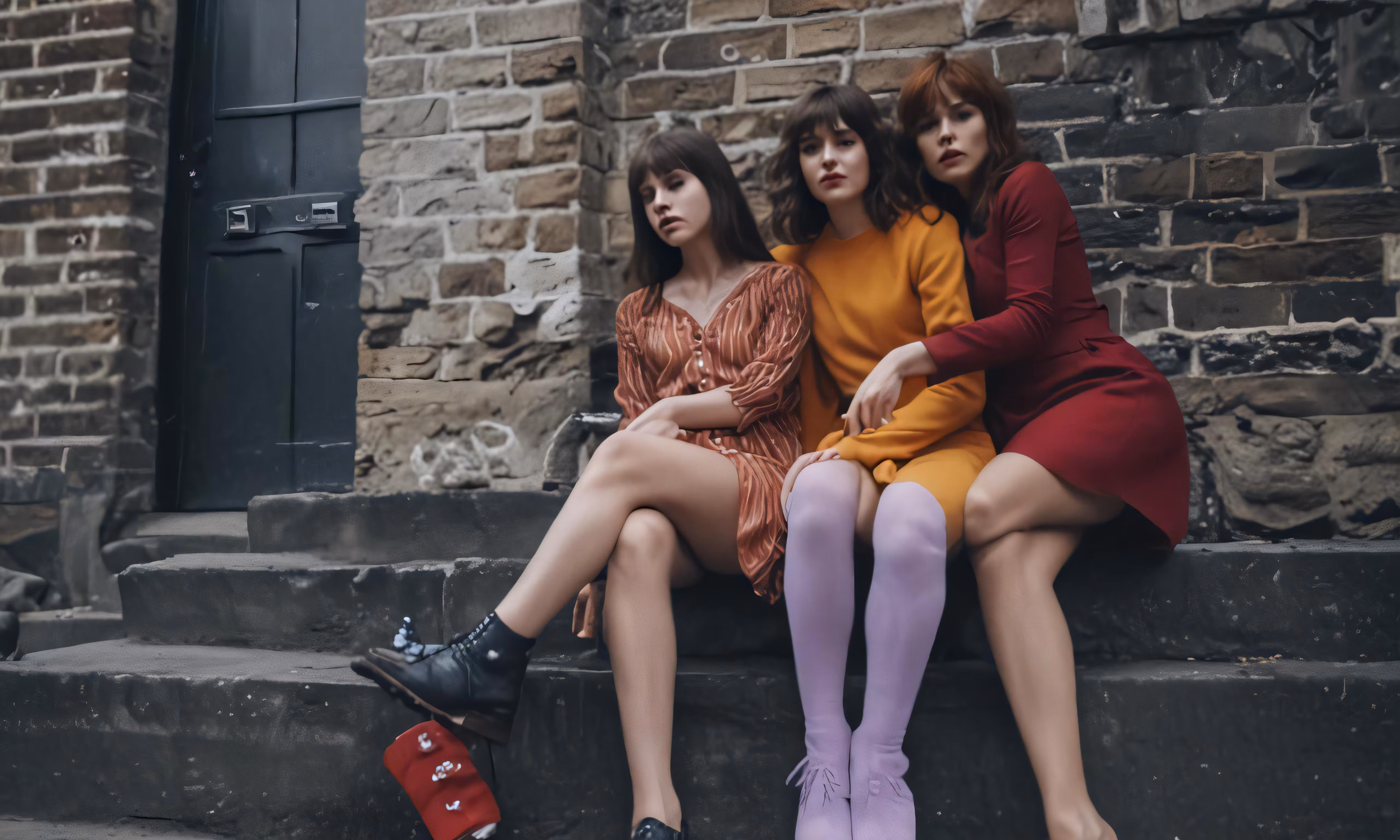 High resolution picture, free to use, three girls sit on a step together wearing knee high socks and knee high boots