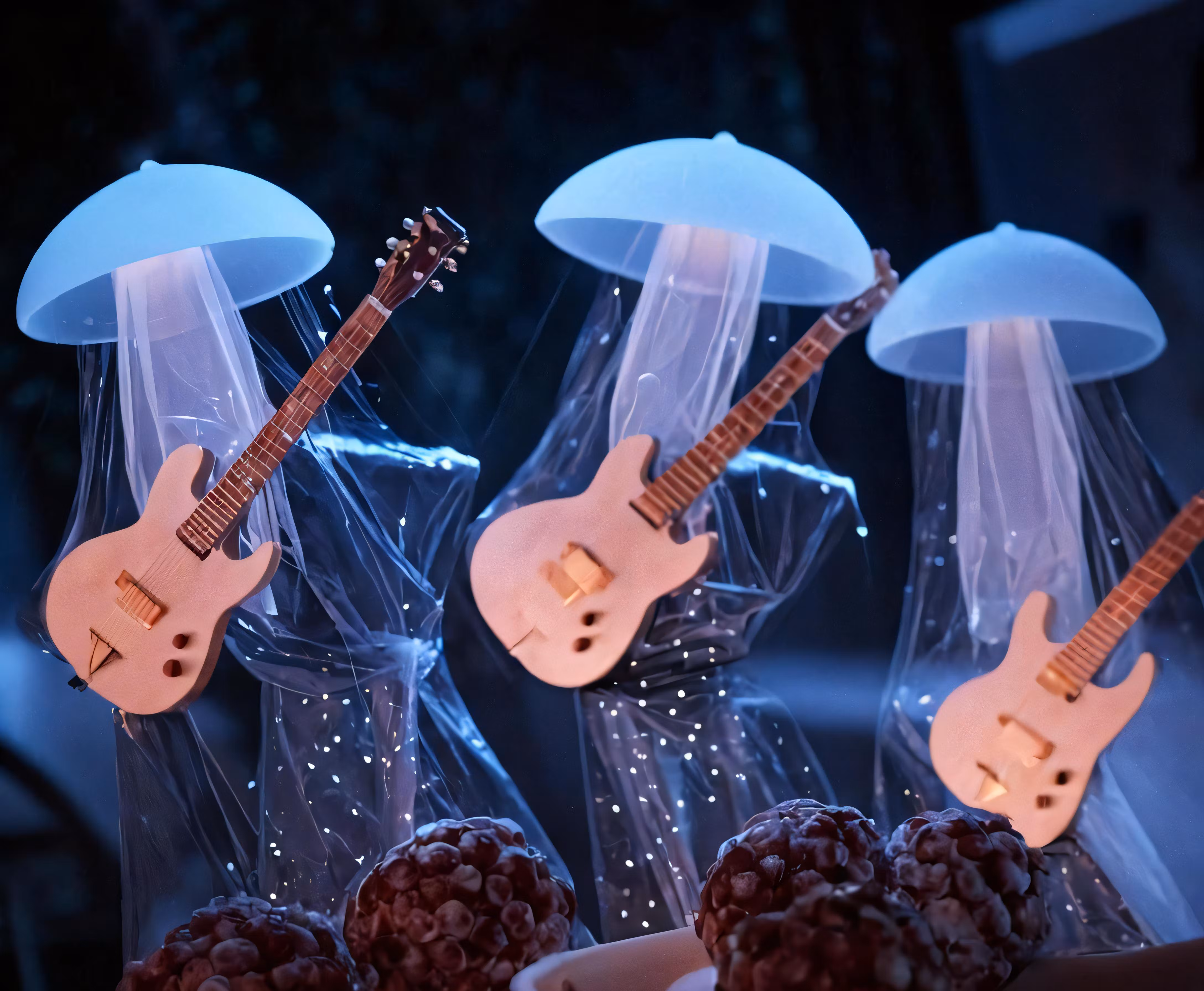 High resolution picture, free to use, three guitars made out of plastic sitting on some grapes