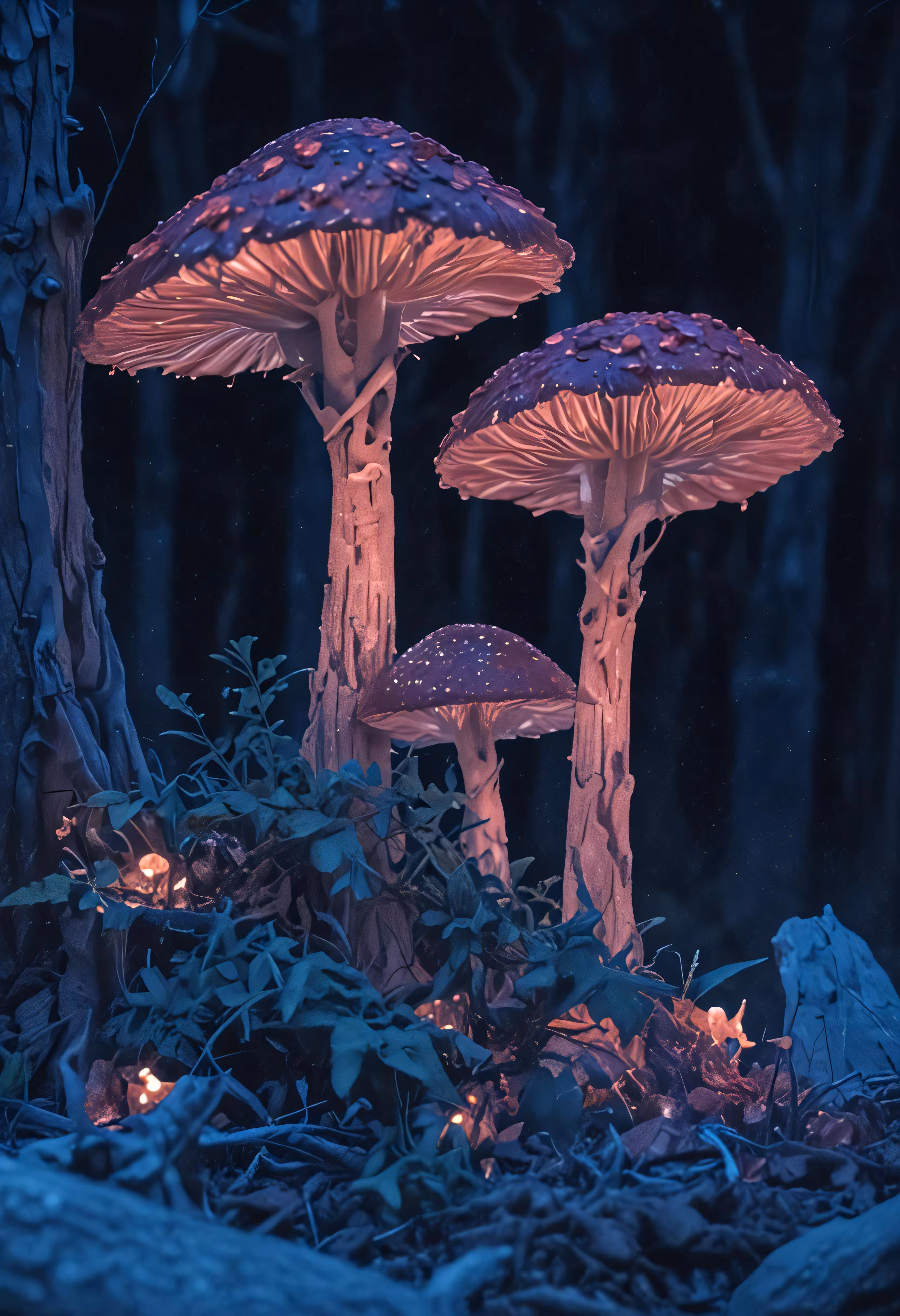 High resolution picture, free to use, three large purple mushrooms that are under some trees