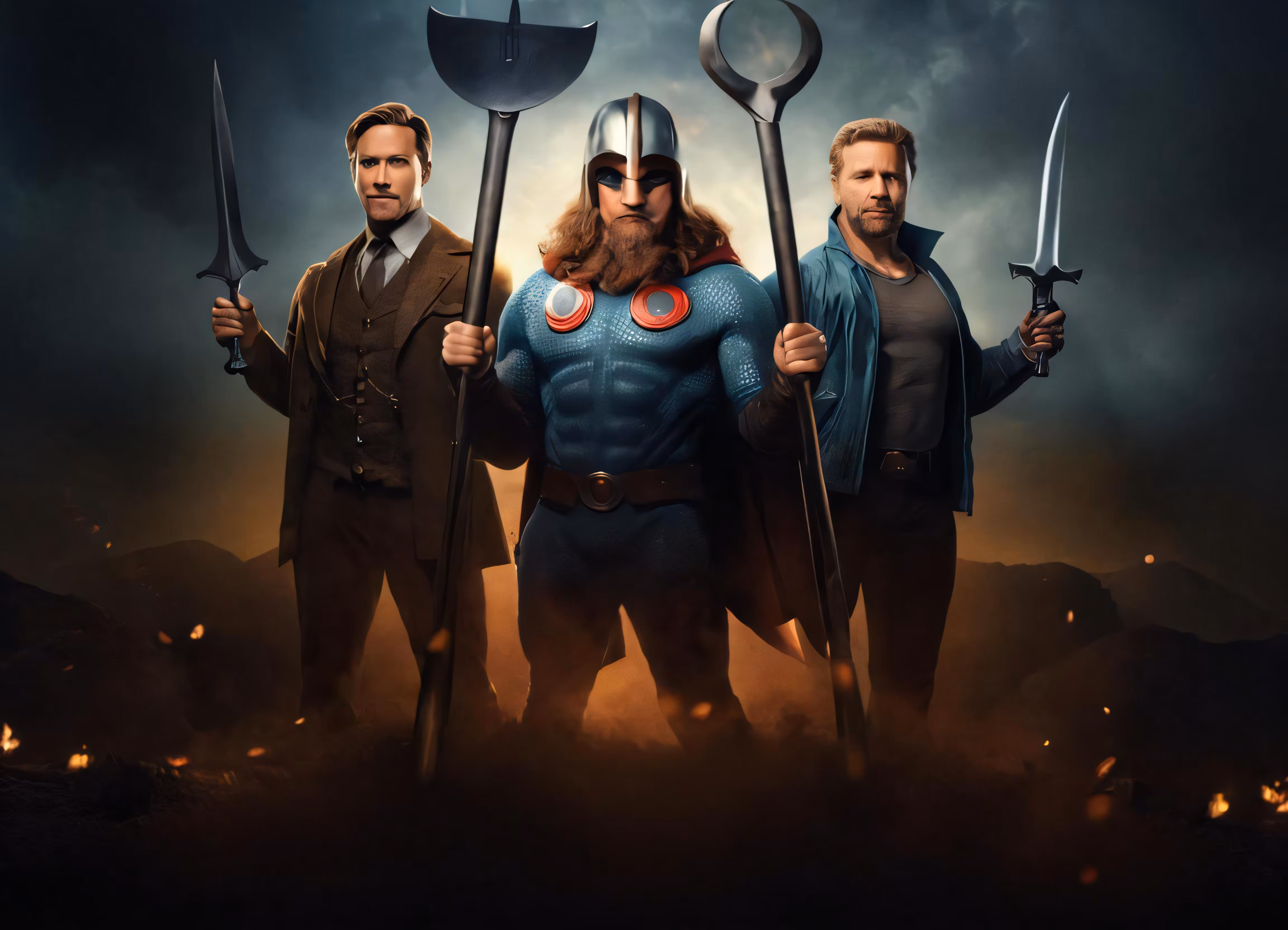 High resolution picture, free to use, three men holding large axes, standing behind them